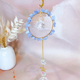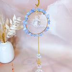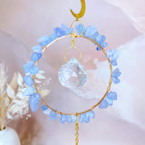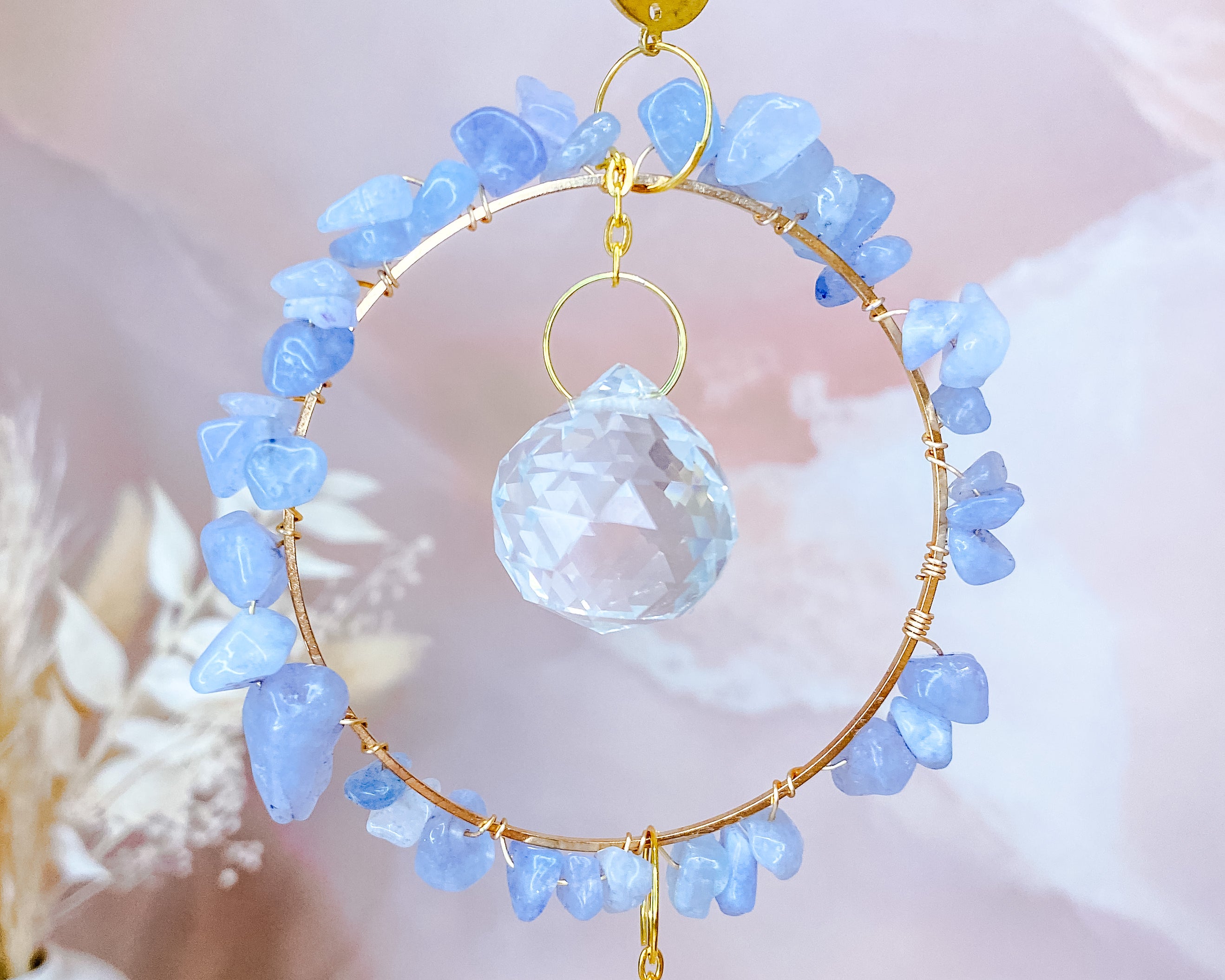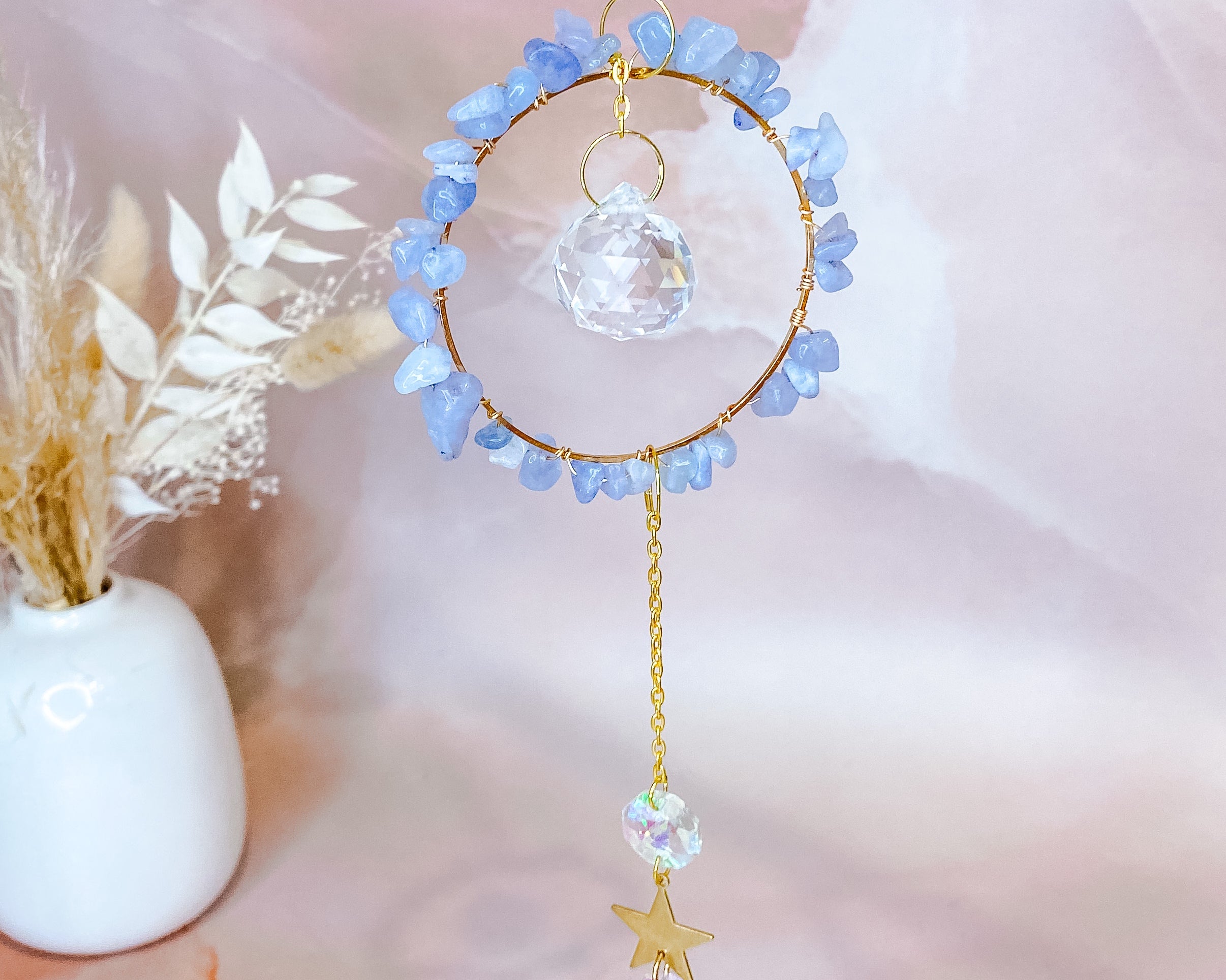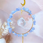 ⟡ Our Aquamarine Circle Suncatchers feature a gold chain along with a delicate gold circle adorned with Aquamarine pebbles. We love how our circle shaped suncatchers have two clear faceted acrylic circles, meaning they are able to reflect even more light and rainbows. These suncatchers radiate such bright, positive energy and reflect rainbows when the sun is out. They would make the perfect addition for your bedroom, living room, garden or patio!