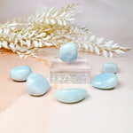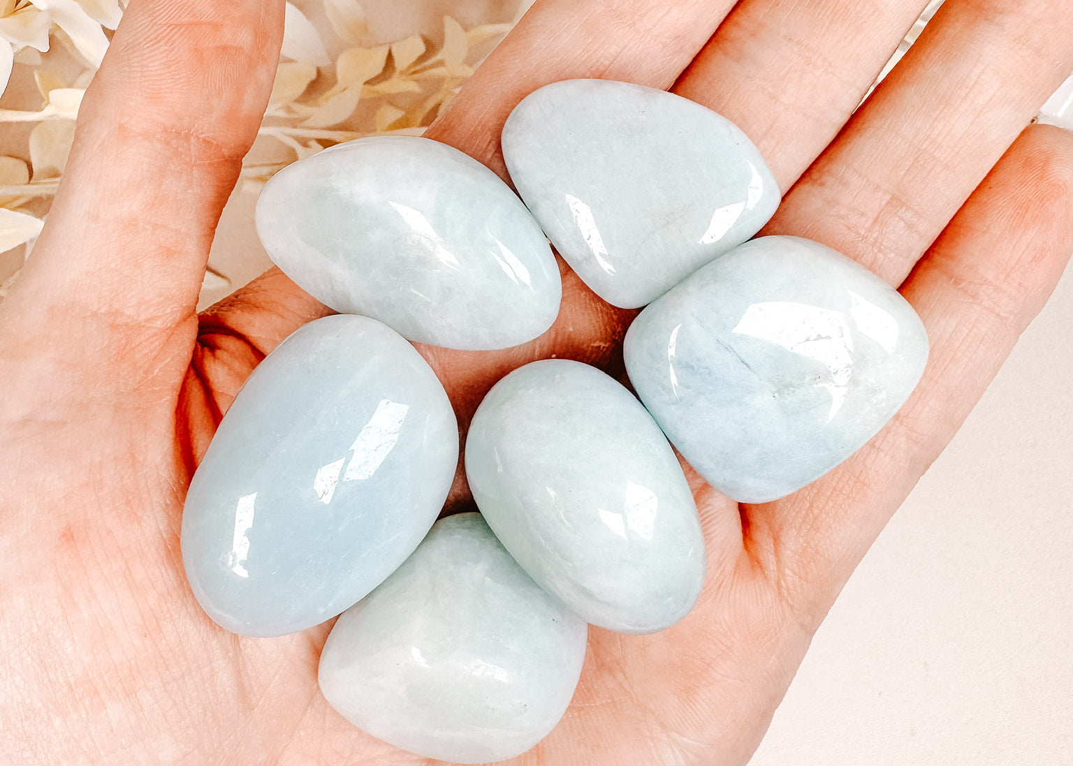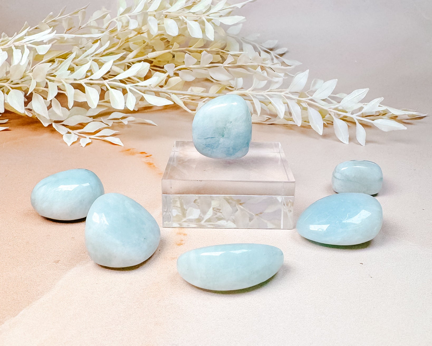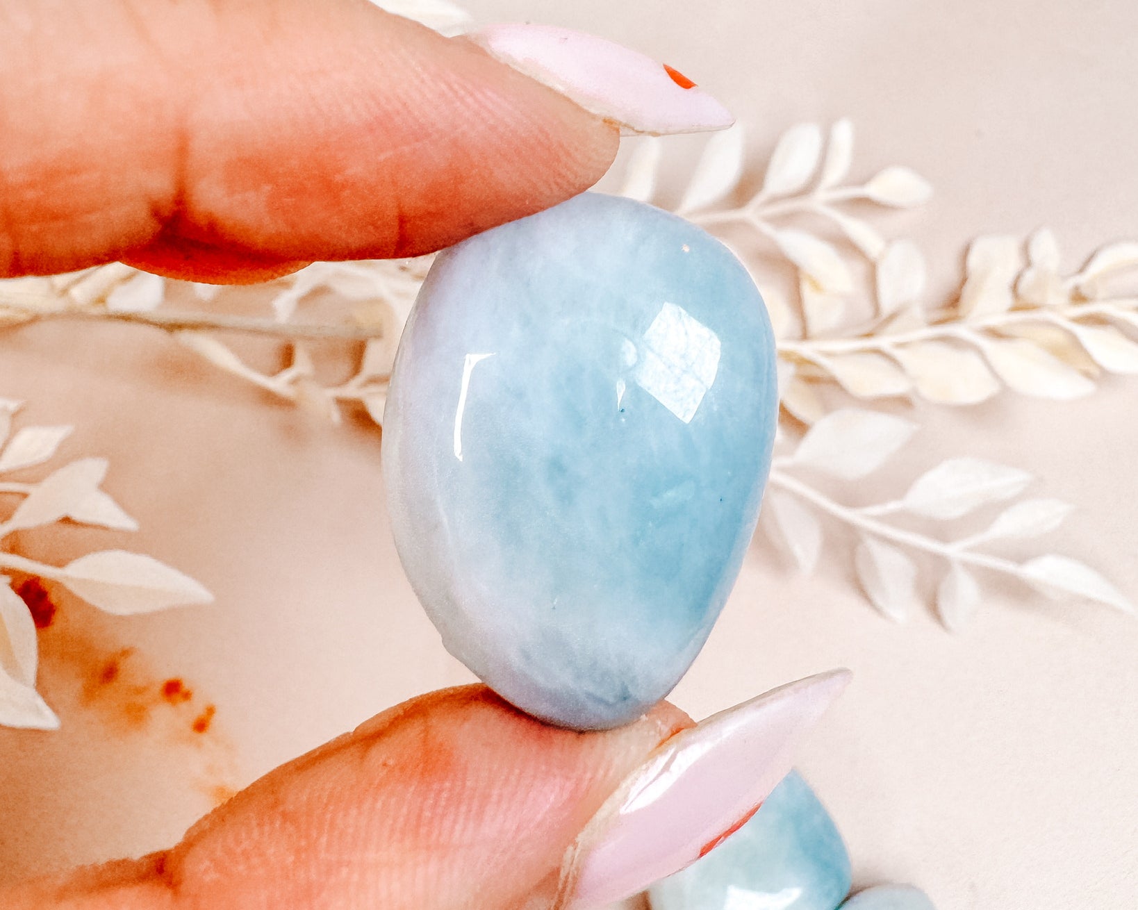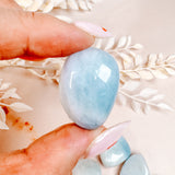 ⟡ We have never carried polished Aquamarine tumbles in our shop and had to snatch some for ya'll because we thought they would make amazing pocket pieces. Each tumble that we sourced all have the softest tones of pastel blue and some have sheen and glitter! These tumbles are essential for on the go use & can even be used for meditation on days where you feel stressed, anxious or worried.