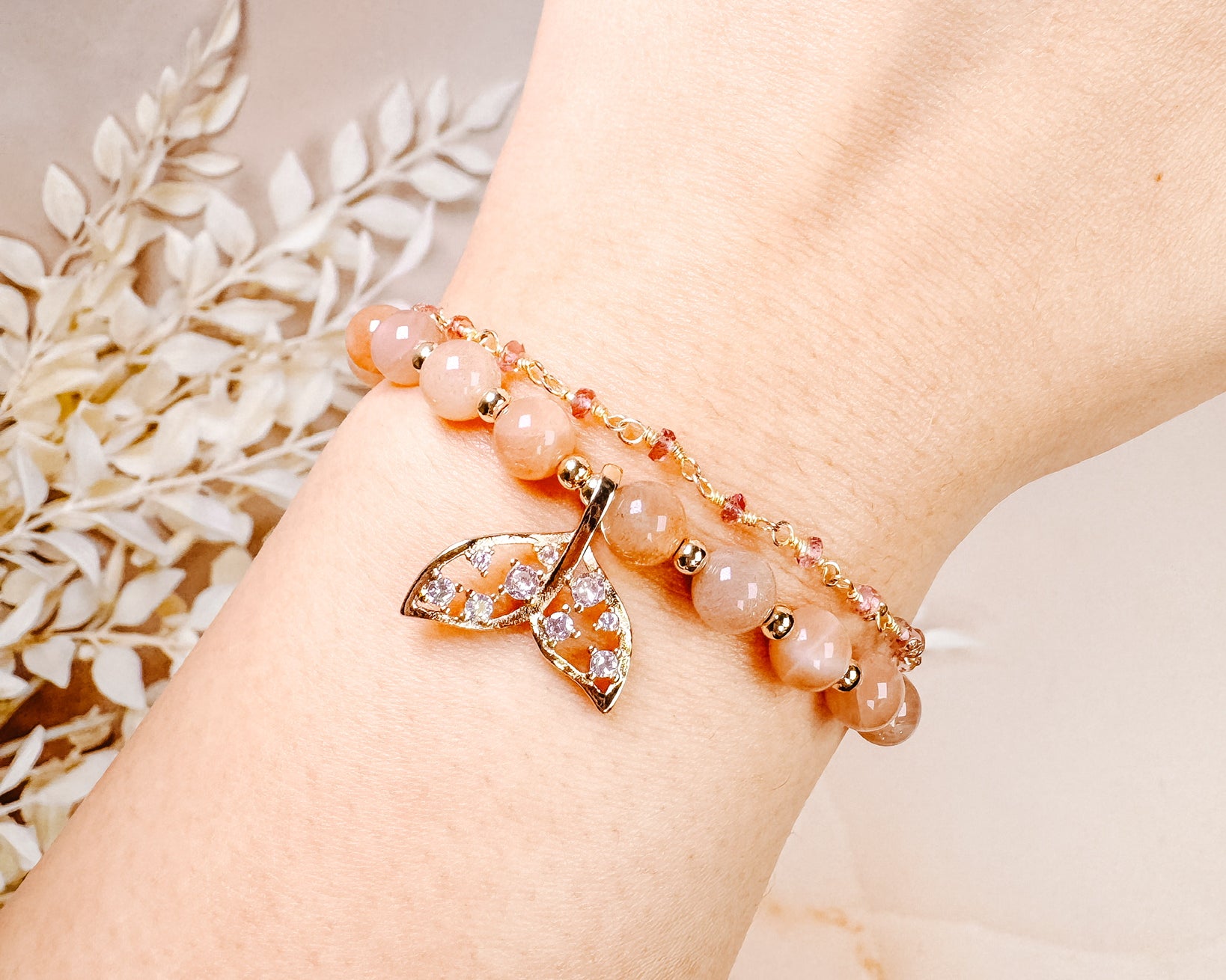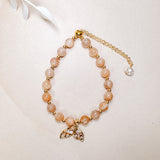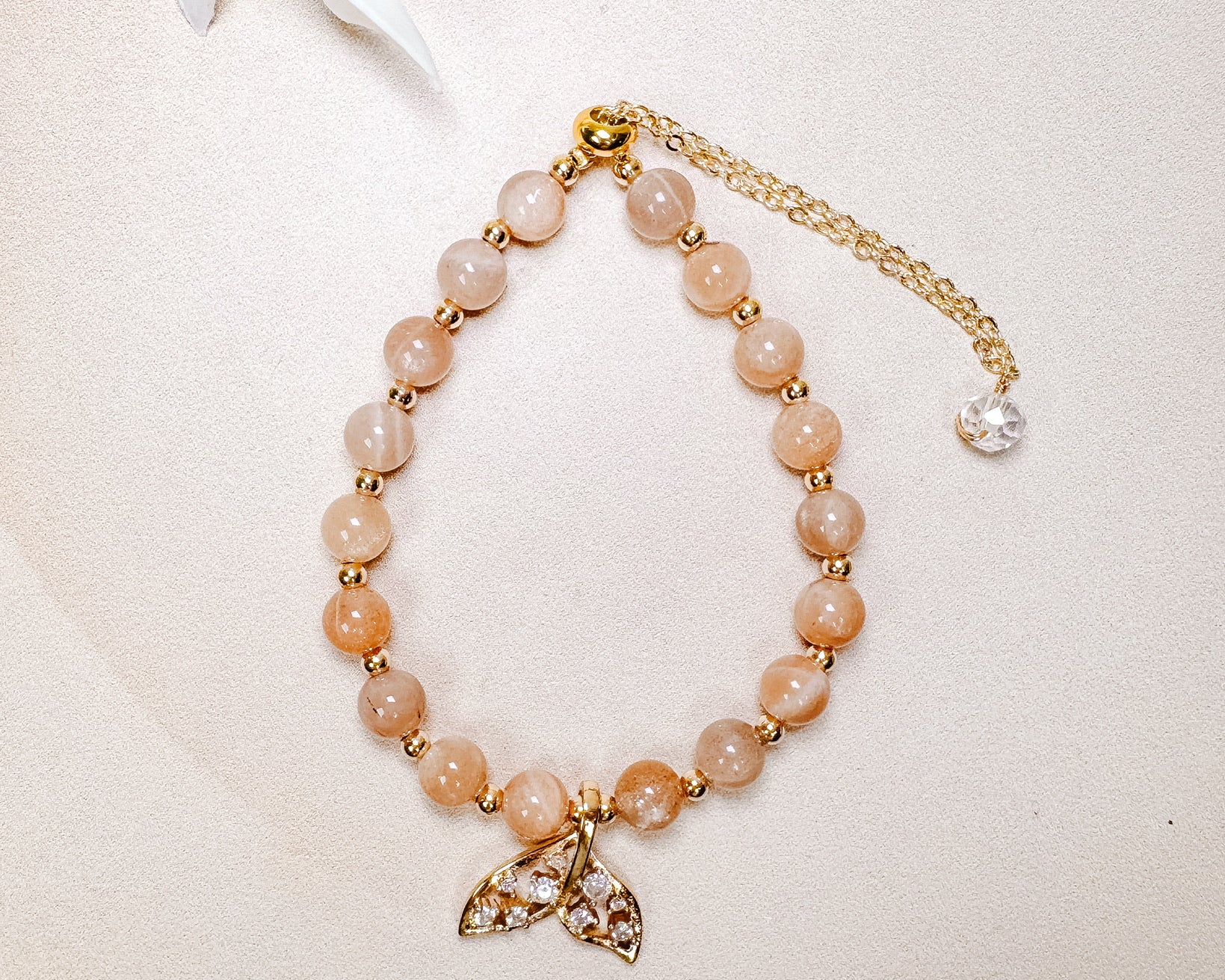⟡ Our "Ariel” Peach Moonstone bracelets with gold plated hardware is one of our brand new bracelets that just arrived! These gorgeous gold bracelets are fully adjustable & feature HQ, flashy Peach Moonstone beads along with a gold mermaid tail charm & cubic zirconia stones!
