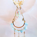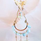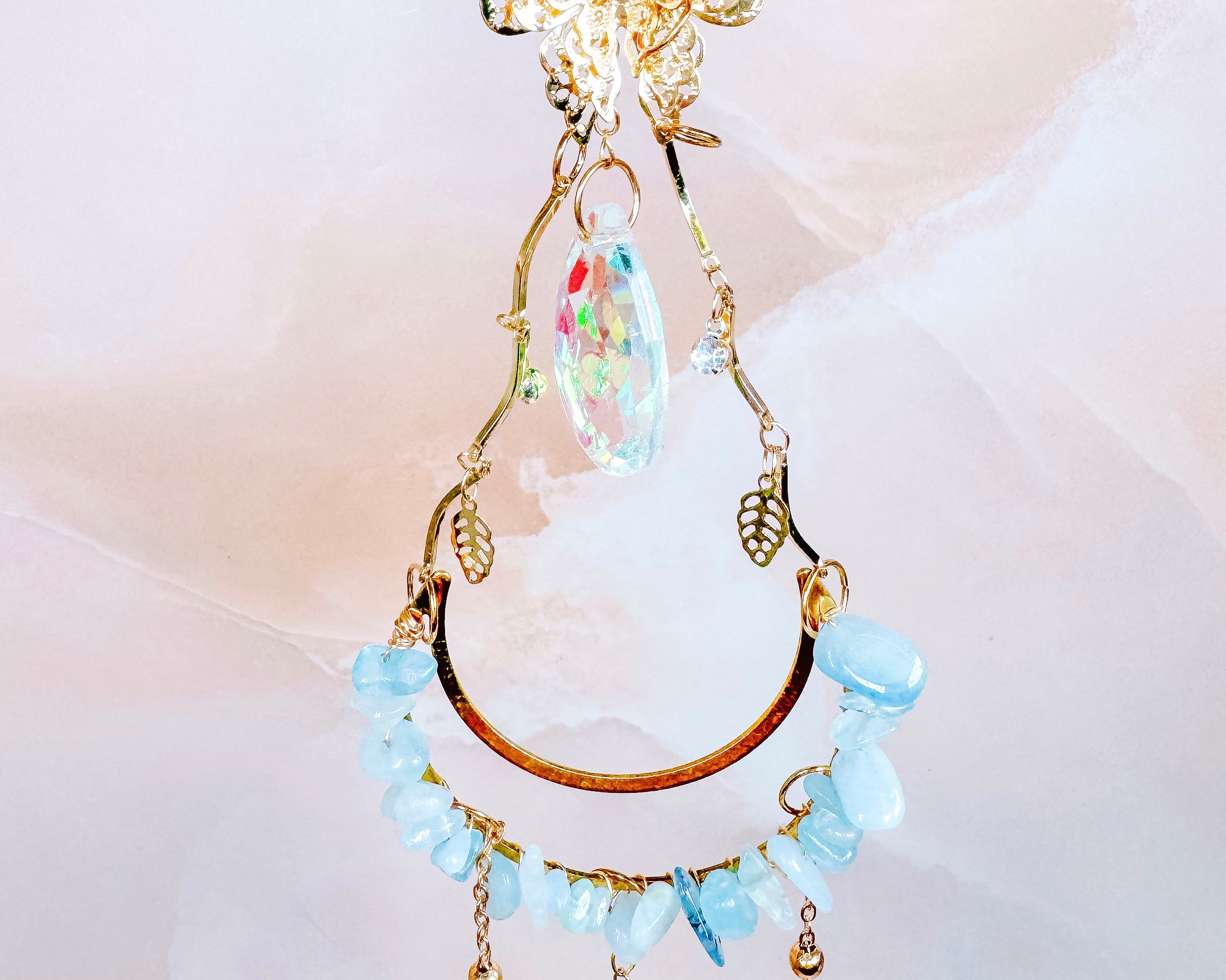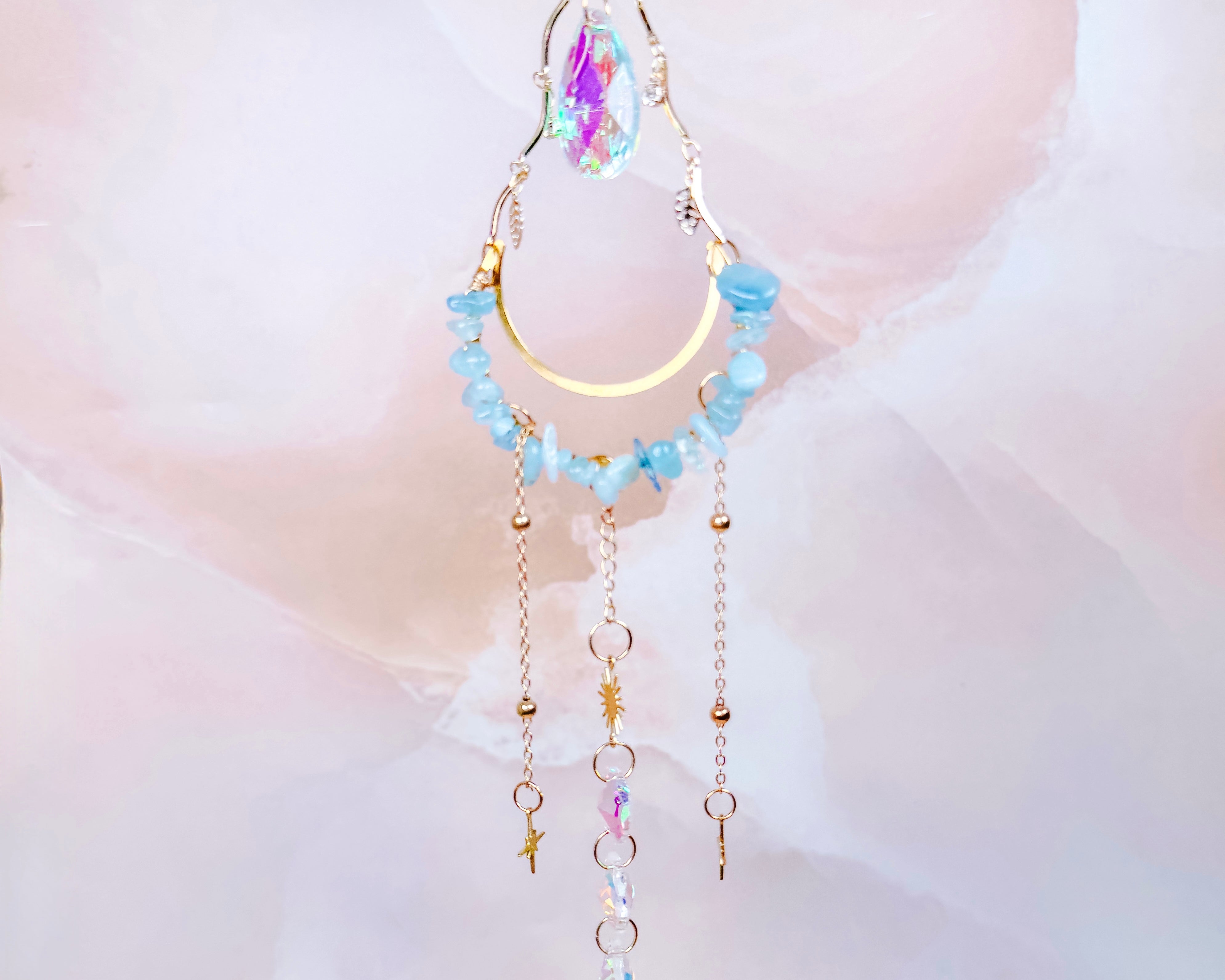 ⟡ Our brand new suncatchers are incredibly dainty with gold accents such as a butterfly and an upside down crescent moon and are available in Aquamarine, Rose Quartz & Blue Lace Agate. This suncatcher is Sydney's favorite and she has a Rose Quartz one tied on her microphone stand!