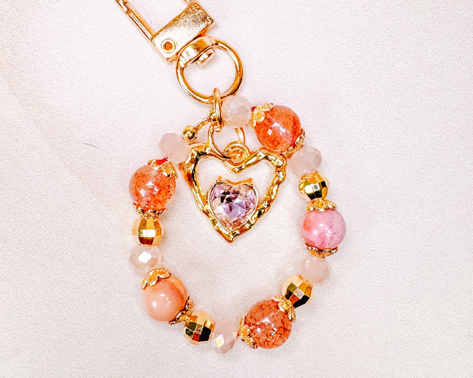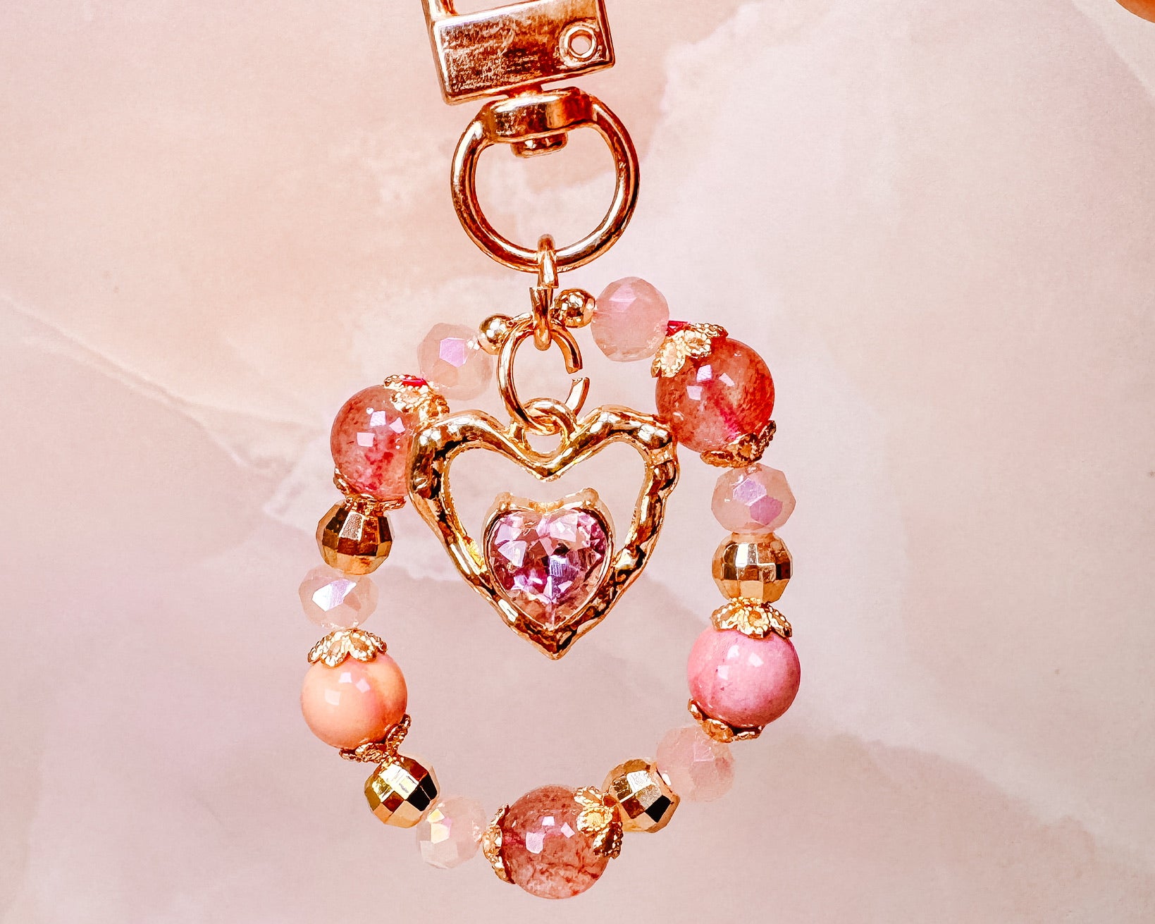 ⟡ Our “Aurora” Rose Gold Keychains were custom designed by us and feature pastel Polychrome Jasper beads along with Tanzberry Quartz (Strawberry Quartz) beads & the prettiest heart charm with a pink cubic zircornia stone! These keychains are the cutest accessory to attach to your keys, backpack, purse, etc. We have a very limited amount of these keychains so make sure to get your hands on one!
