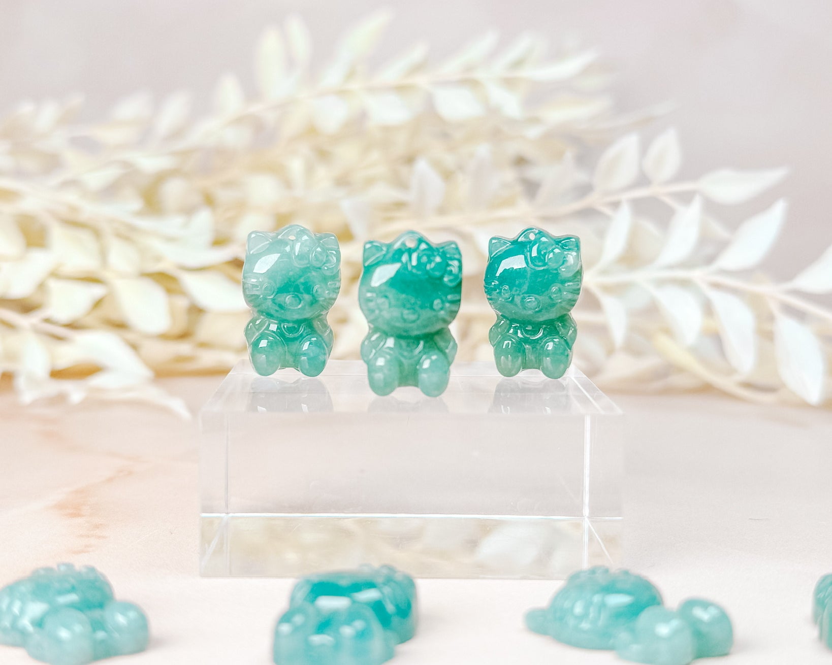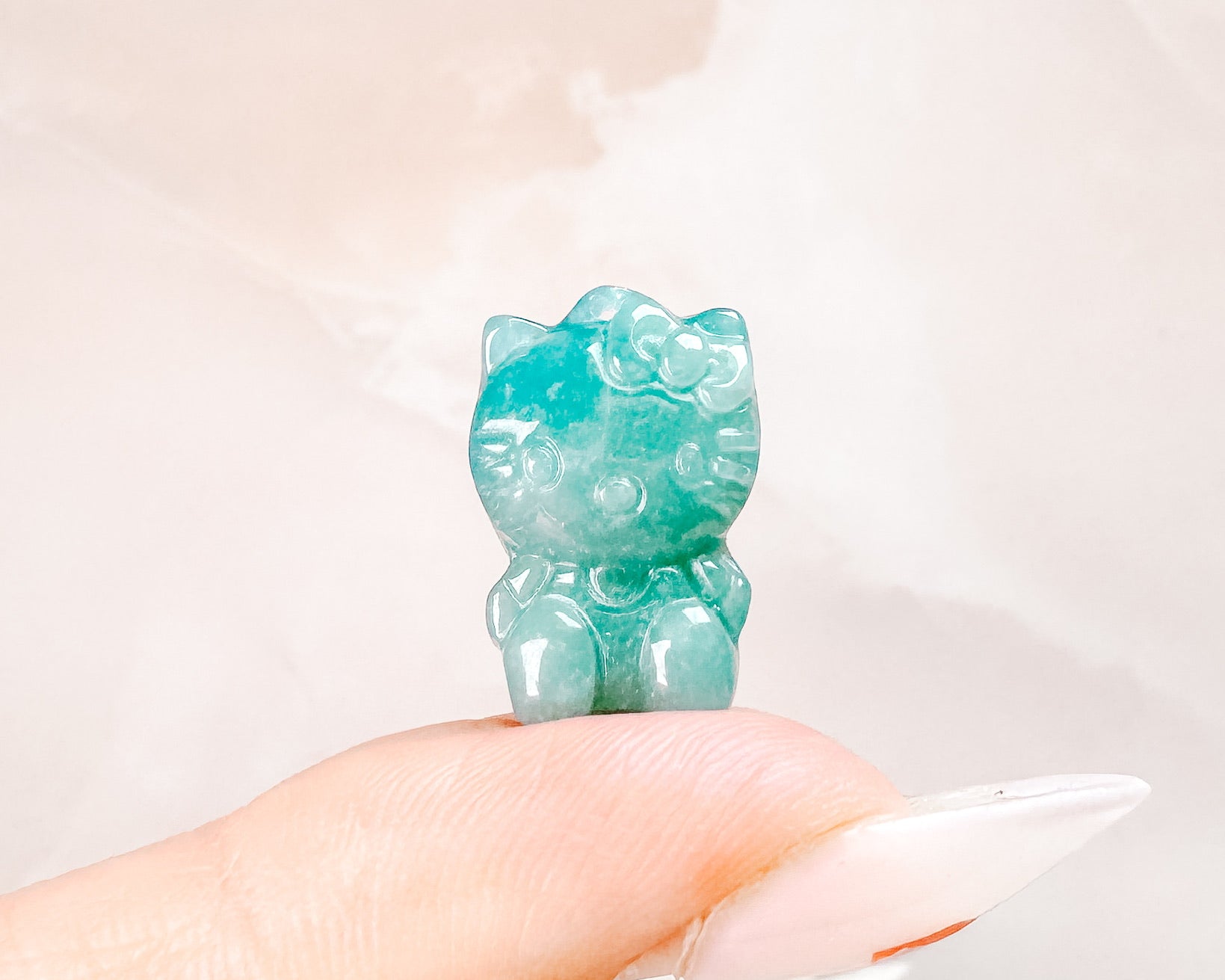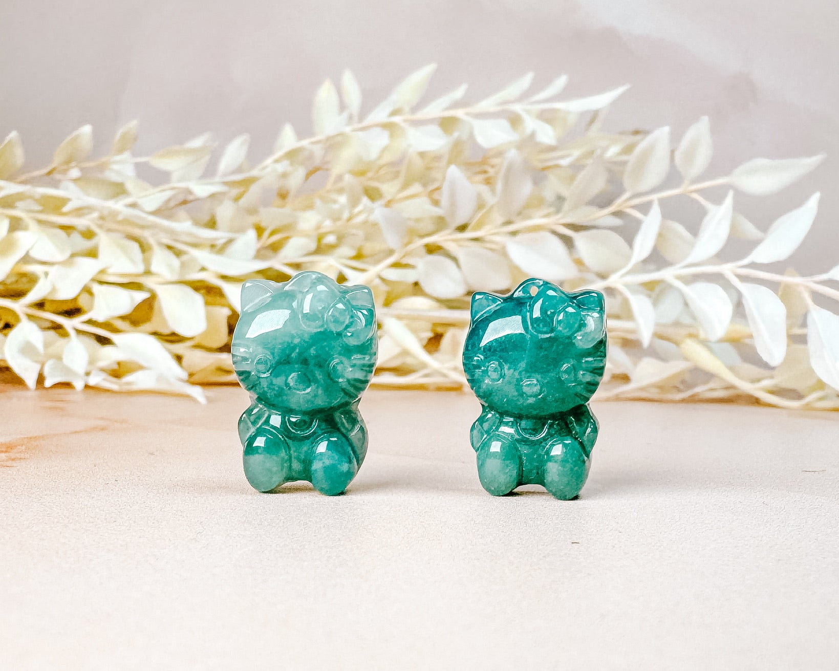 ⟡ Ever since we sold Jadeite Hello Kitty necklaces in our shop, we've been on the hunt for more of these mini Hello Kitty carvings! Jade has been one of our favorite stones to source as of recently, we love how each piece of jade has their own unique attributes and different shades of green. These mini carvings all have drill holes making them perfect if you make jewelry!