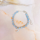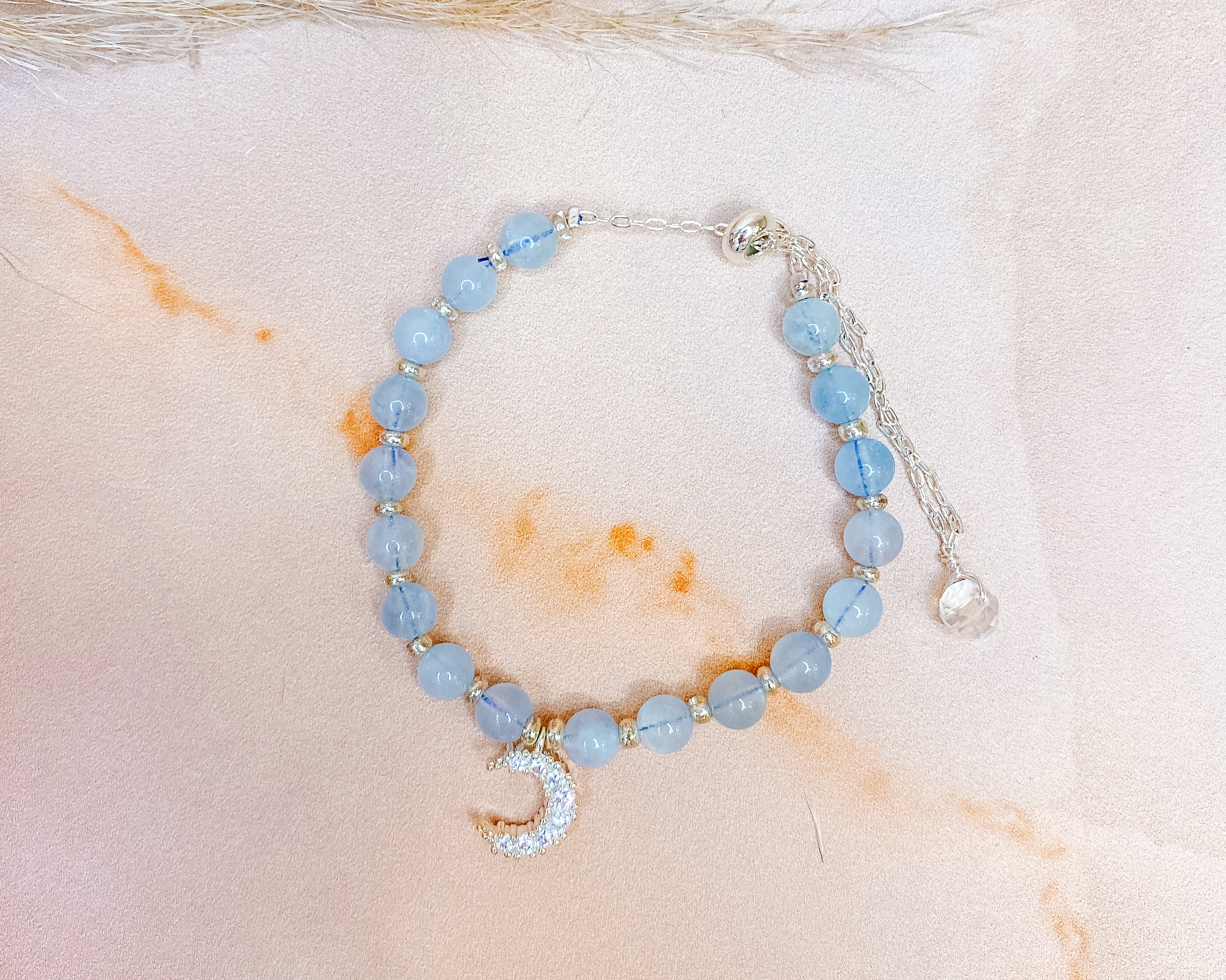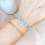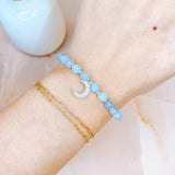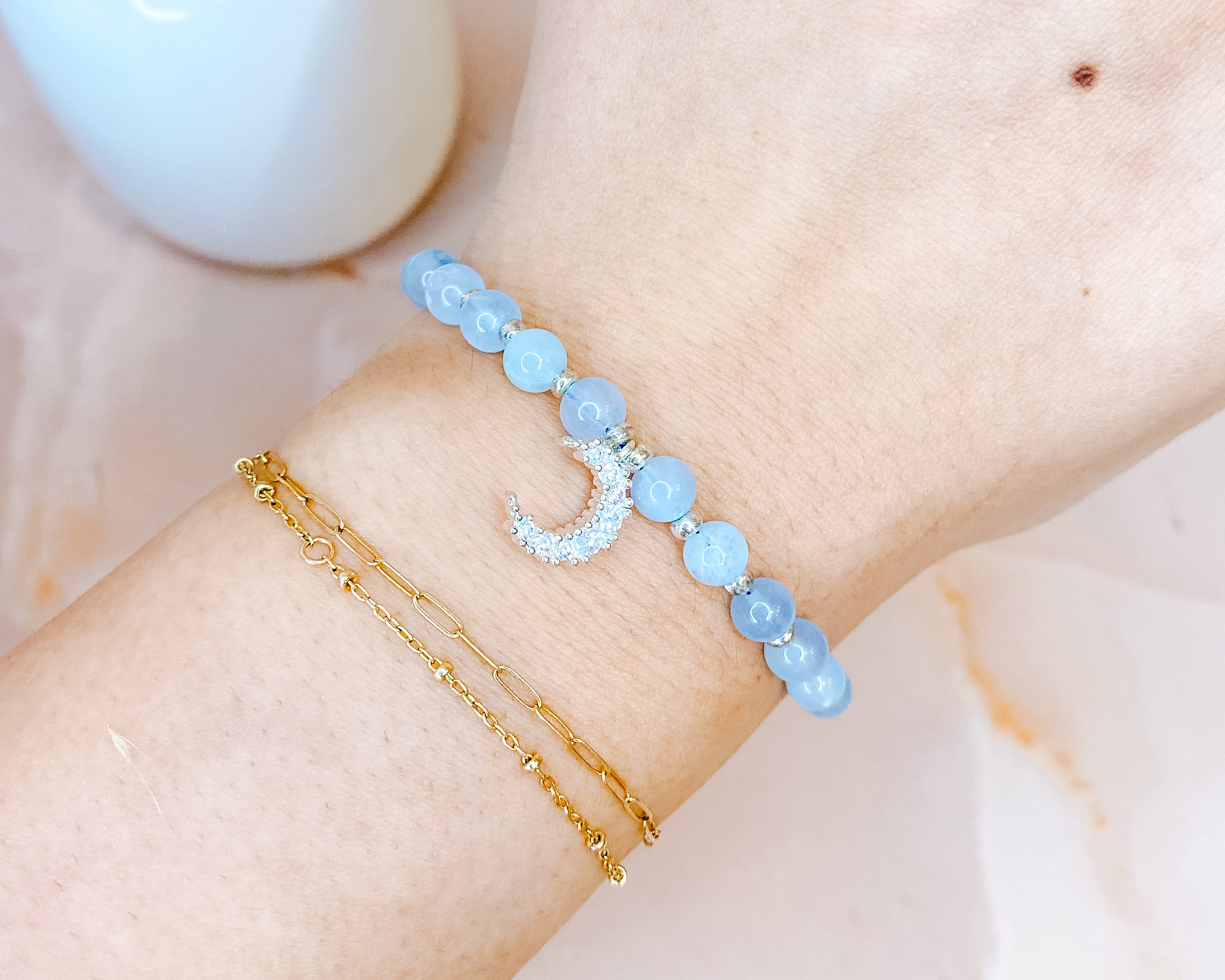 ⟡ Our "Celestial" Aquamarine Bracelet features a silver chain bracelet that is fully adjustable with icy Aquamarine beads (approximately 6mm) featuring a sparkly rhinestone crescent moon charm. The simplicity of this bracelet paired with the dainty crescent moon charm make this one of Sydney's favorite styles!