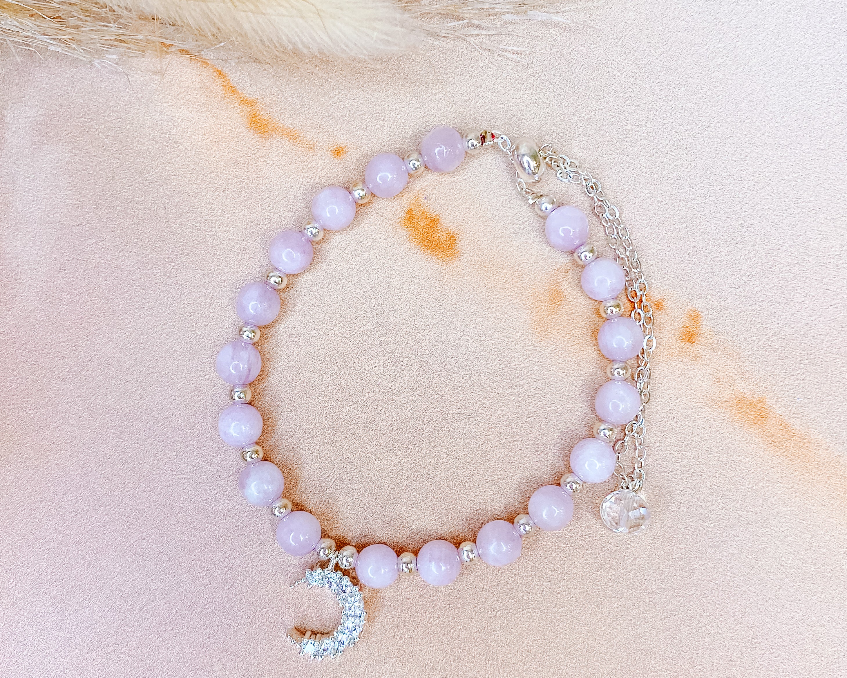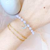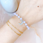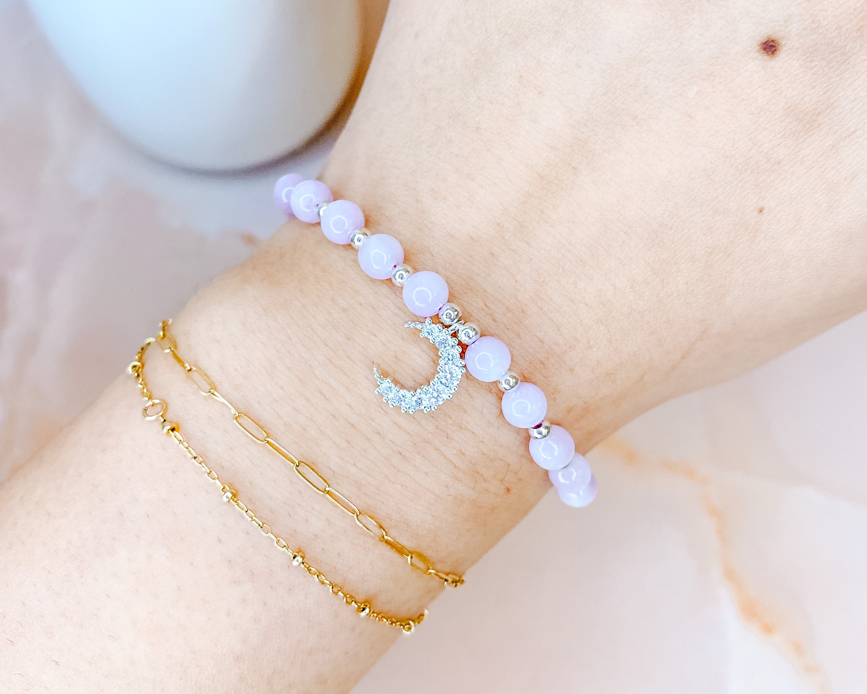 ⟡ Our "Celestial" Rose Quartz Bracelet features a silver chain bracelet that is fully adjustable with pastel pink Rose Quartz beads (approximately 6-7mm) featuring a sparkly rhinestone crescent moon charm. The simplicity of this bracelet paired with the dainty crescent moon charm make this one of Sydney's favorite styles!
