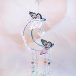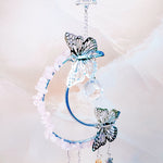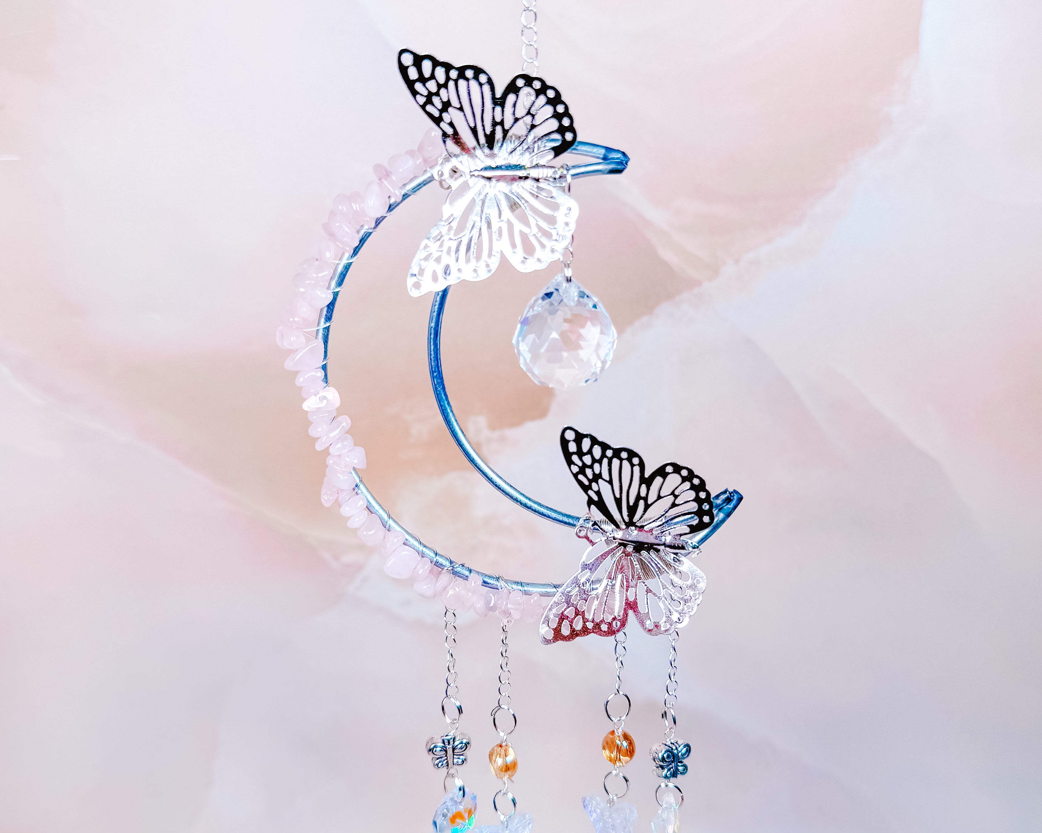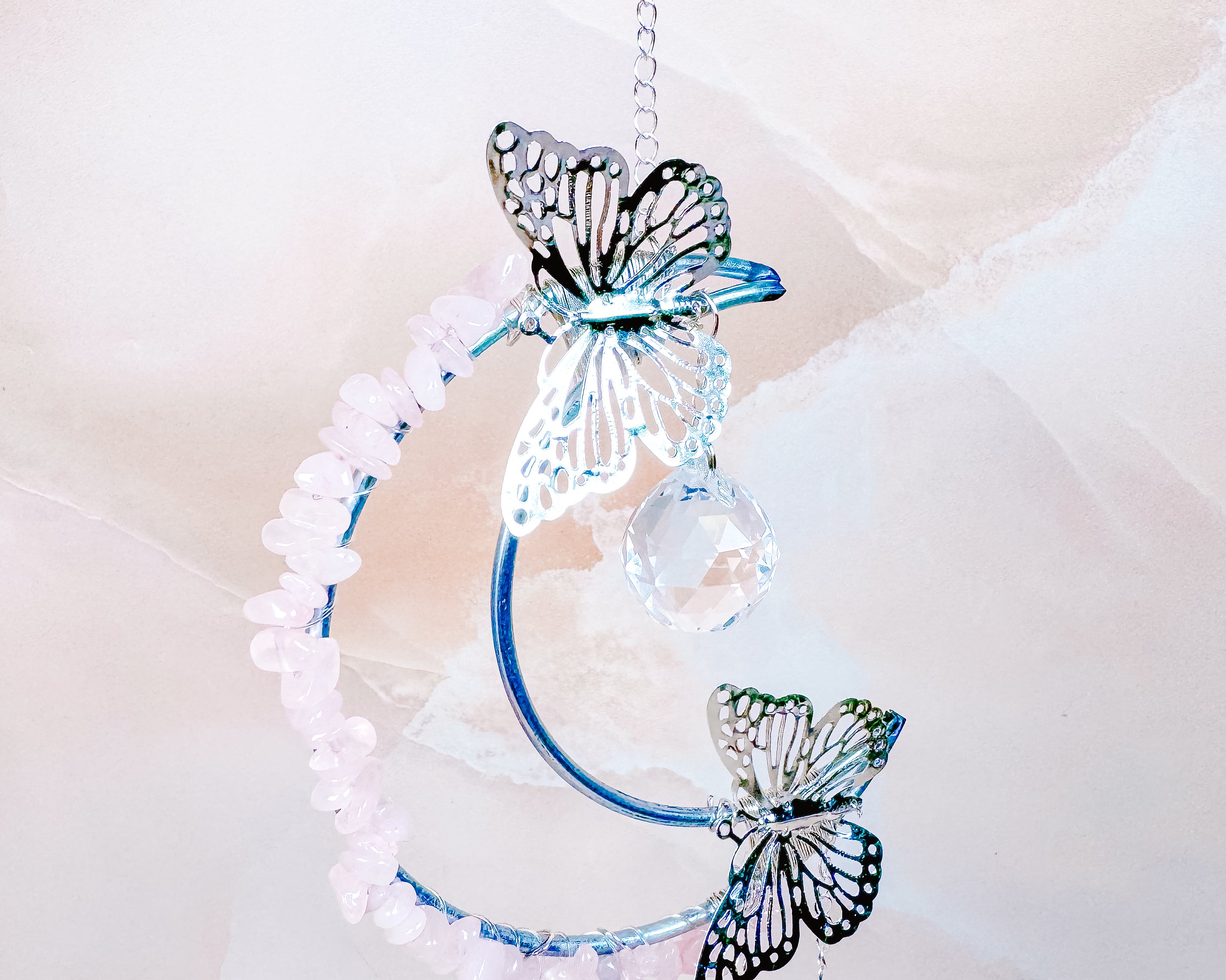 ⟡ Our brand new suncatchers are a favorite among our regulars! This style features a chunky silver crescent moon with two butterflies and are available in Amethyst, Rose Quartz and Aquamarine.