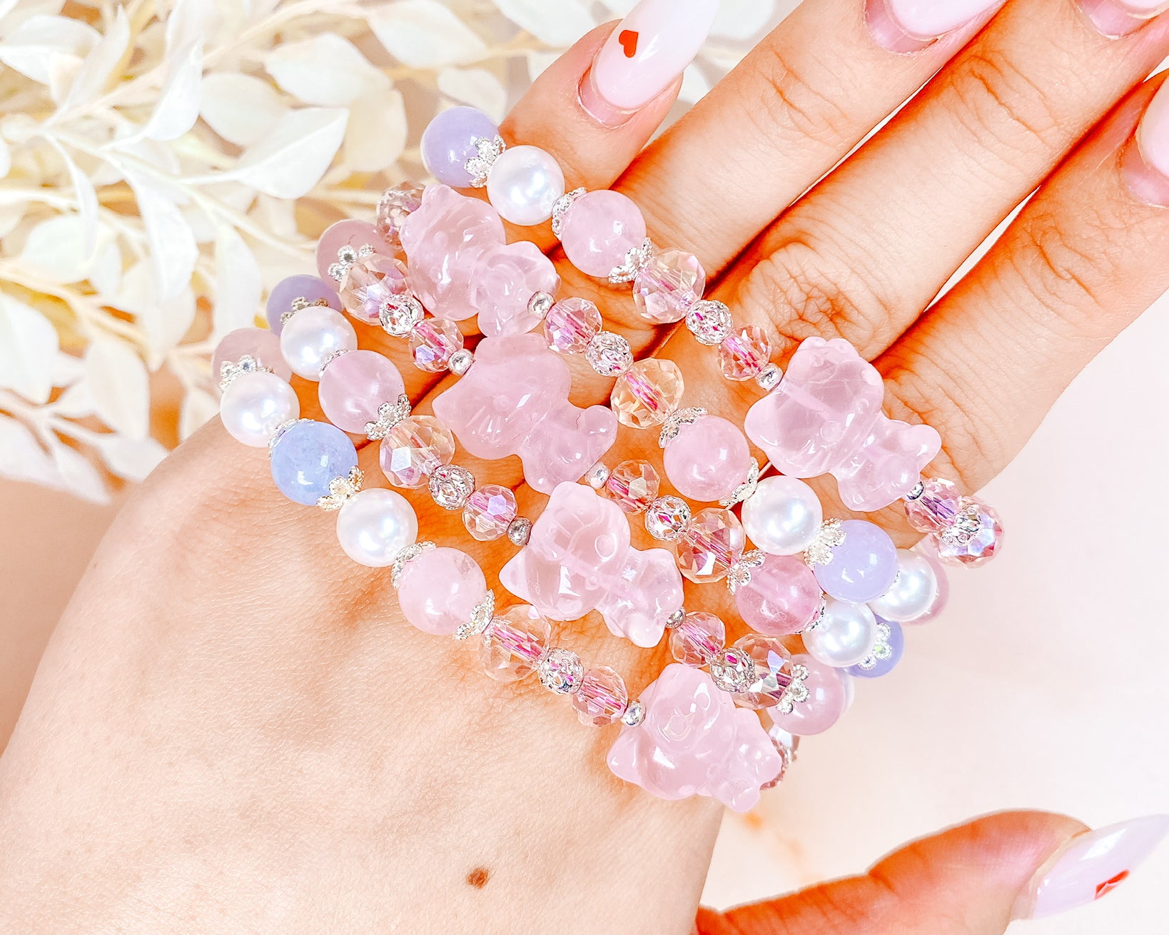 ⟡ Our Hello Kitty Rose Quartz x Blue Chalcedony Bracelet features a silver chain bracelet that is fully adjustable with Rose Quartz, Blue Chalcedony and faux pearl beads along with a HQ Hello Kitty Carving. This is one of our best selling bracelets and remind us of cotton candy skies!