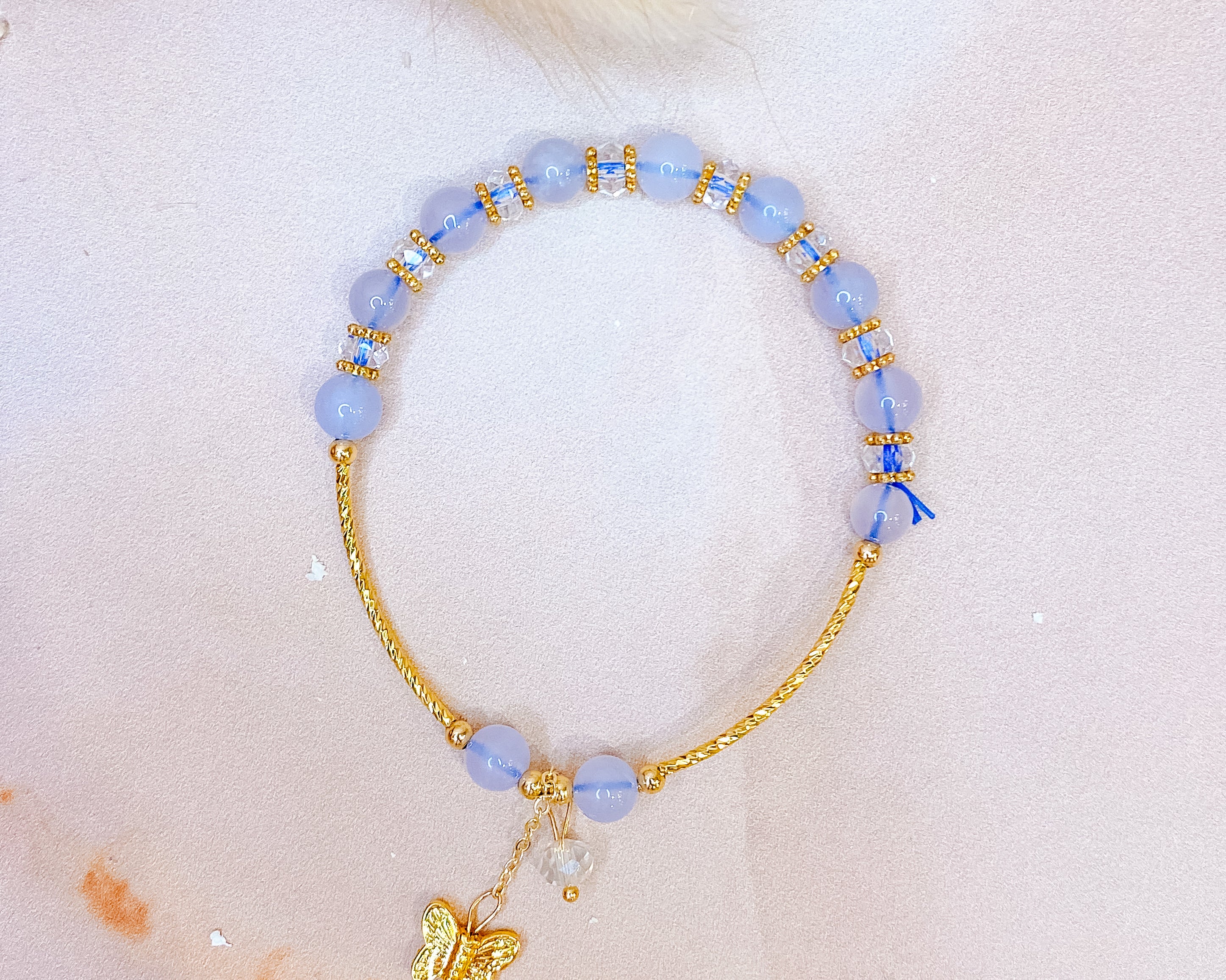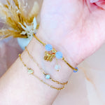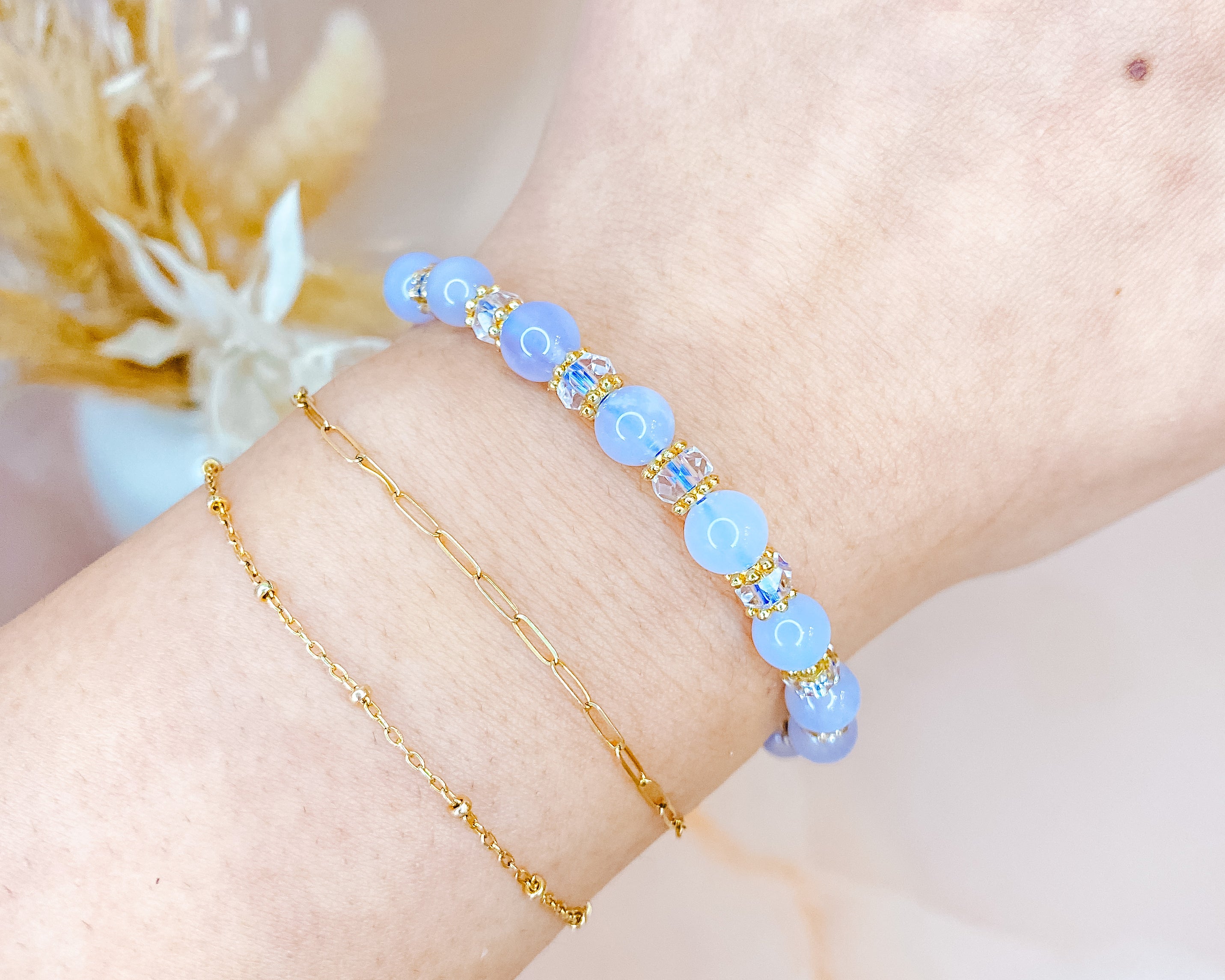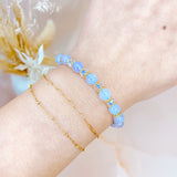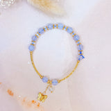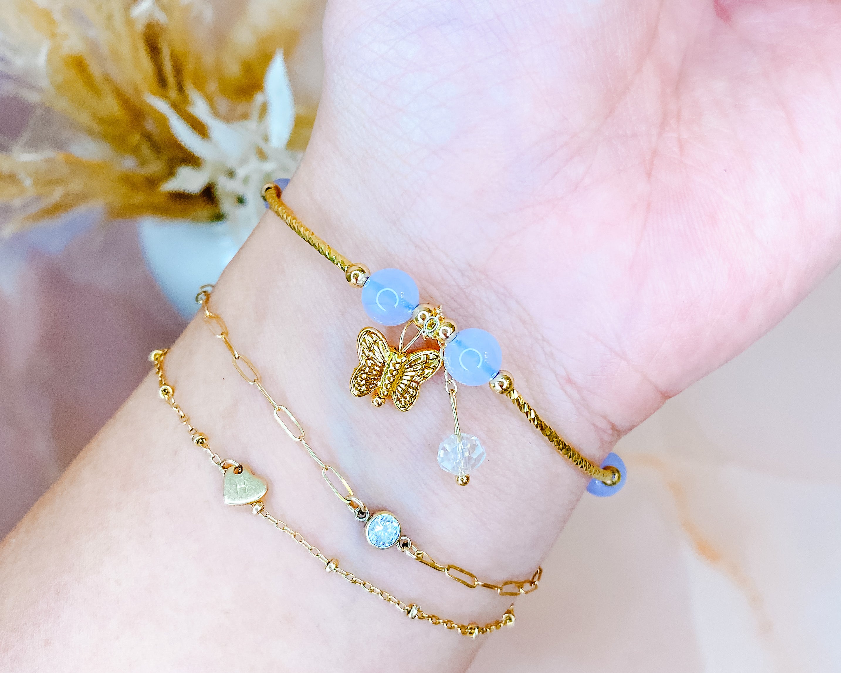 ⟡ Our custom made "Faye" Bracelet Collection are available in Aquamarine, Blue Chalcedony, Girasol Quartz, Rose Quartz and Selenite. Our "Faye" Collection is Hillary's personal favorite out of our entire jewelry collection and she wears one everyday! This bracelet features a stretchy gold band, the cutest dainty gold butterfly charm adjoined with a dangly clear faceted bead and pastel Blue Chalcedony beads.