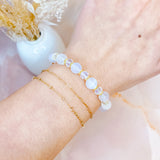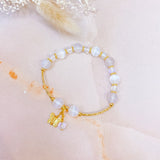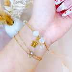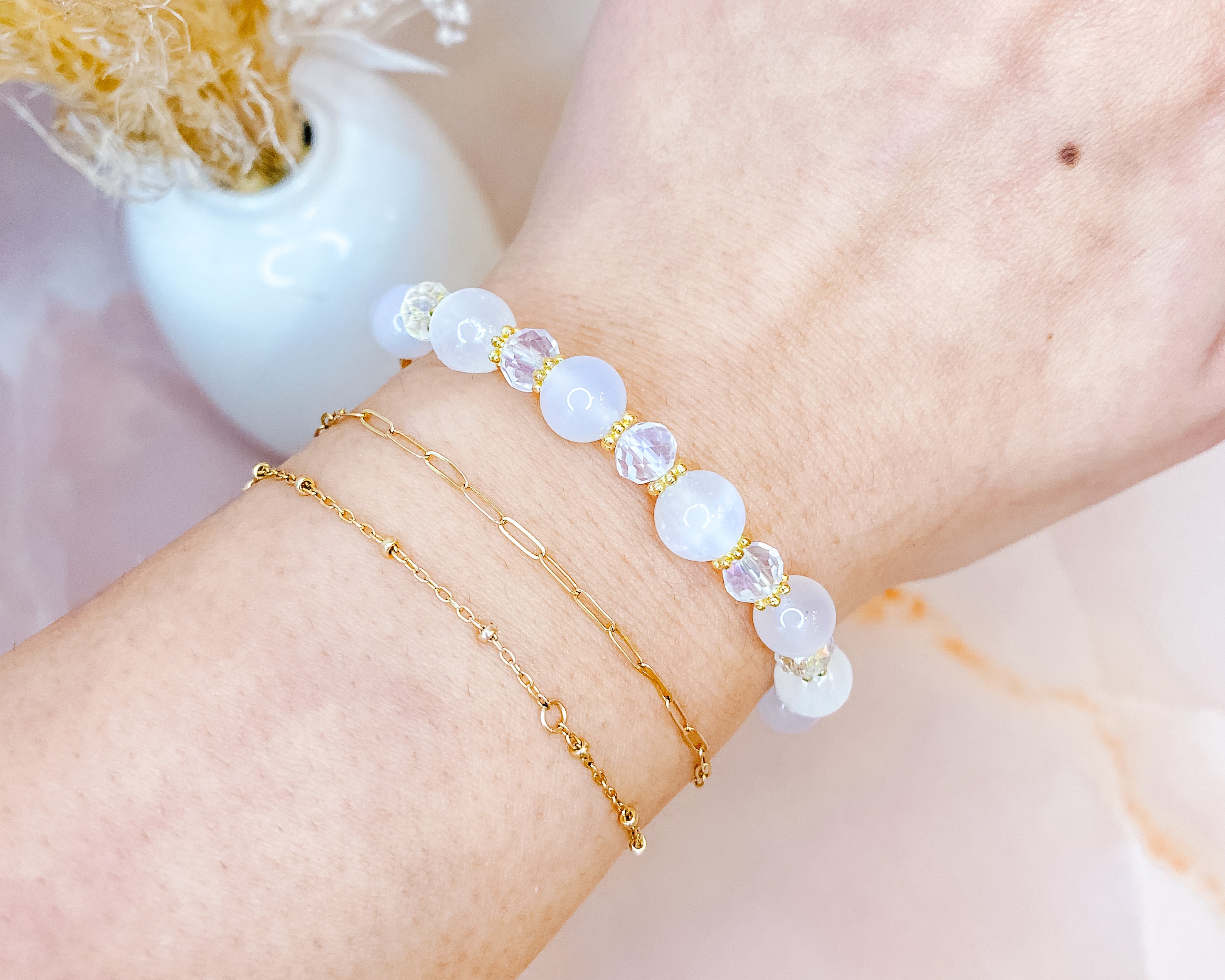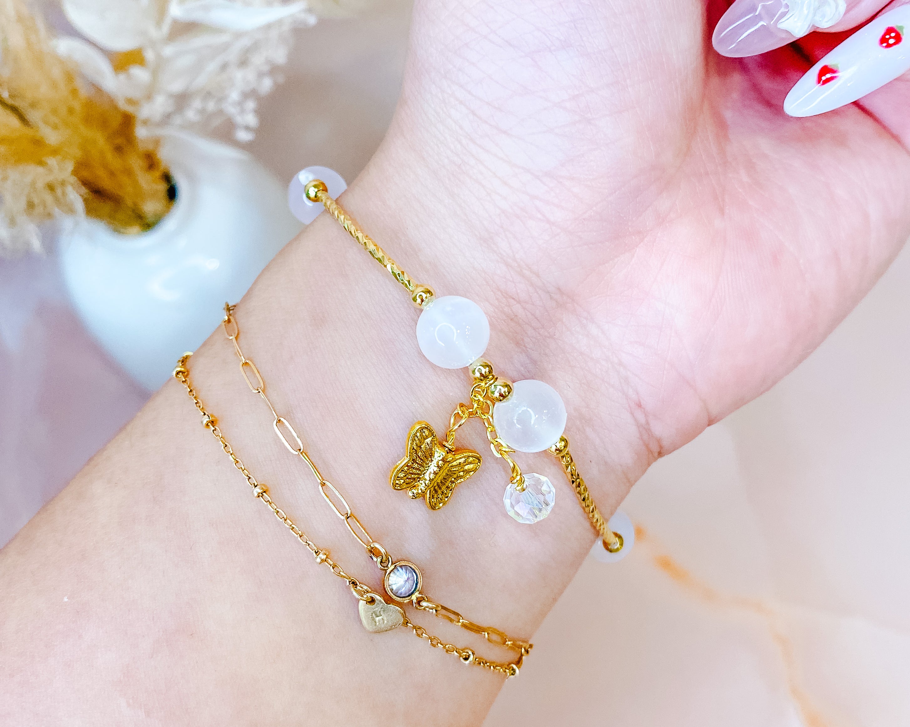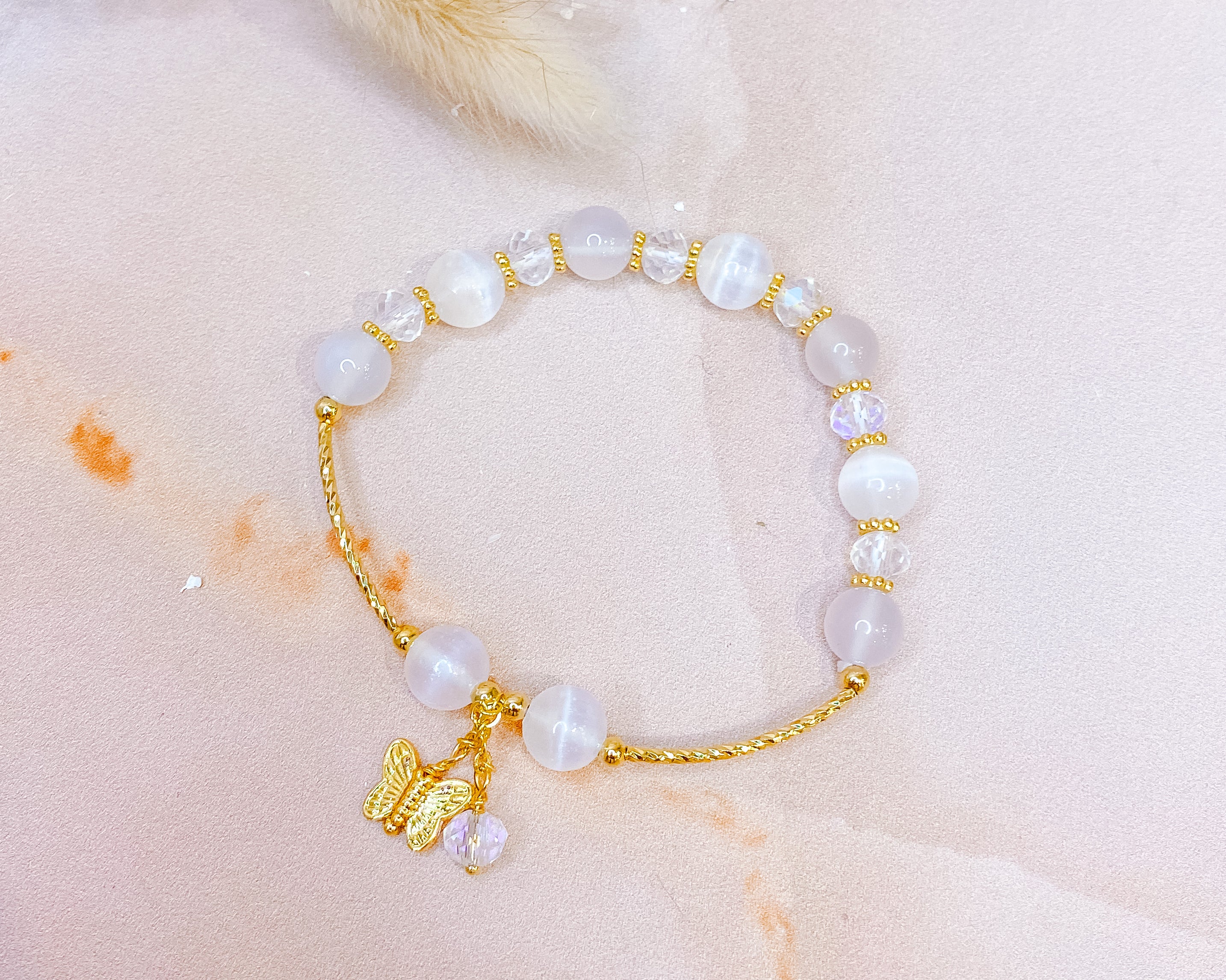 ⟡ Our custom made "Faye" Bracelet Collection are available in Aquamarine, Blue Chalcedony, Girasol Quartz, Rose Quartz and Moroccan Selenite. Our "Faye" Collection is Hillary's personal favorite out of our entire jewelry collection and she wears one everyday! This bracelet features a stretchy gold band, the cutest dainty gold butterfly charm adjoined with a dangly clear faceted bead and Moroccan Selenite beads w/ cat eye flash.