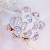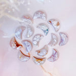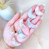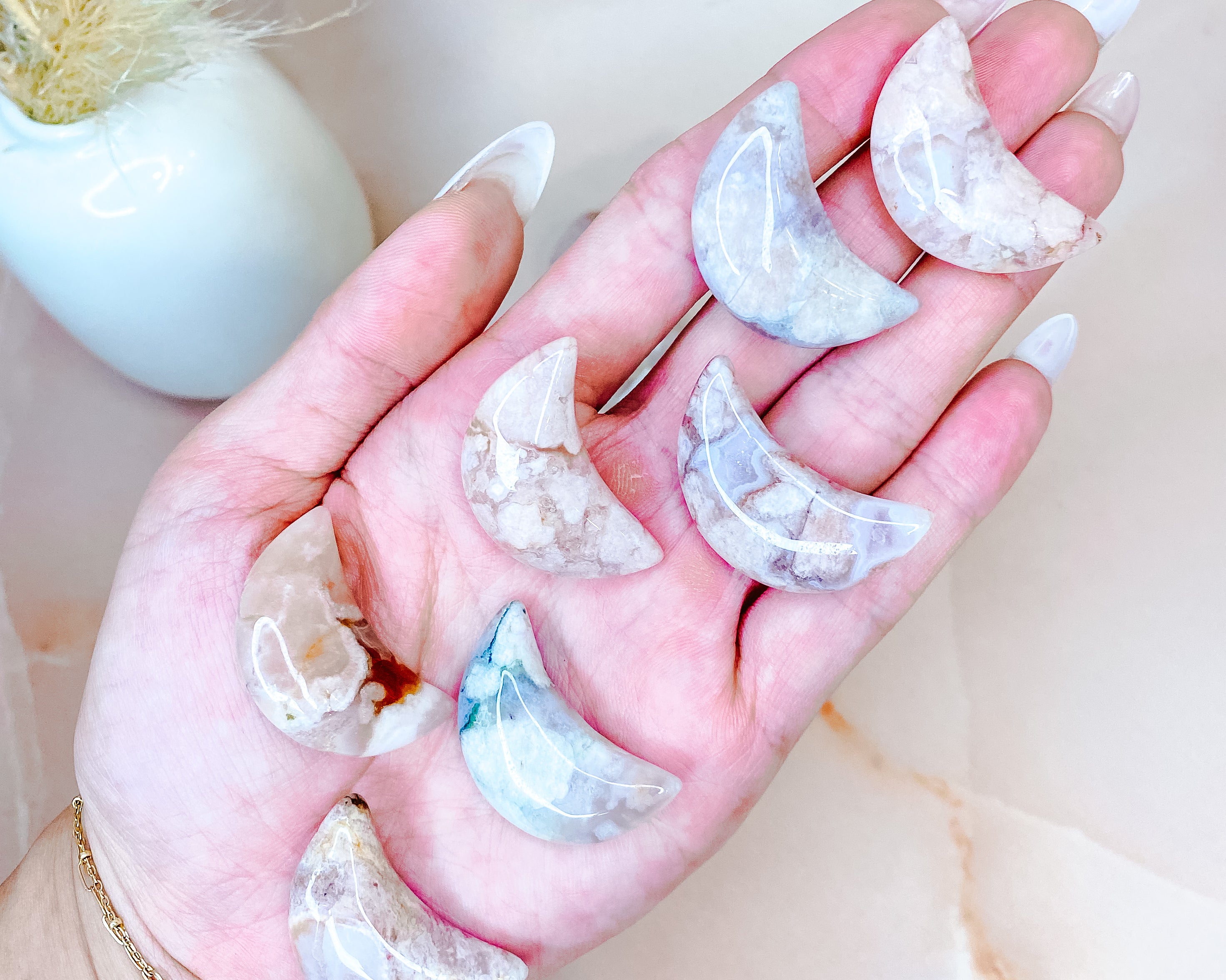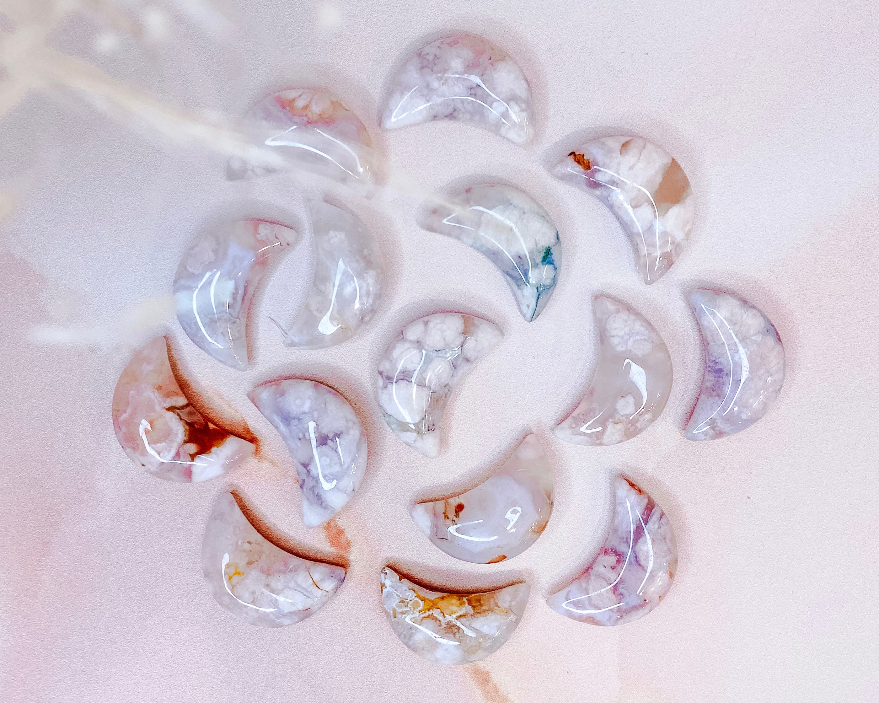 ⟡ Our Mini Flower Agate Moon Carvings are so unique in their own way and we love how puffy and plump these moons are. Some of these moons have gorgeous banding and pastel hues while others are extremely jelly-like with the prettiest plumes. There are even some in this batch with hints of Carnelian and hints of green from Chlorite! Crescent moon carvings symbolize tranquility and protection, making them one of our favorite shapes to work with. We love the strong feminine energy they carry, making them amazing tools for full moon rituals and spiritual work.