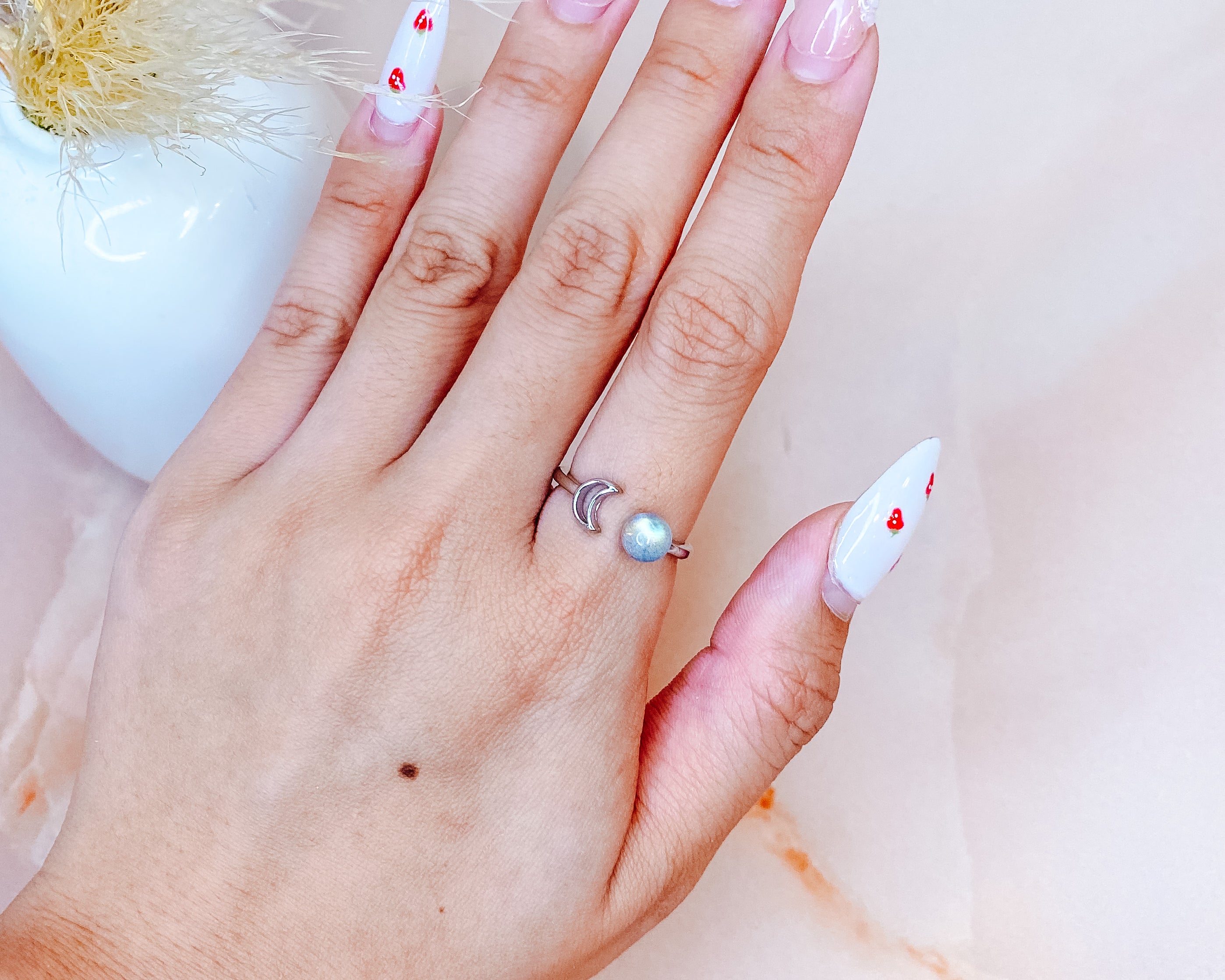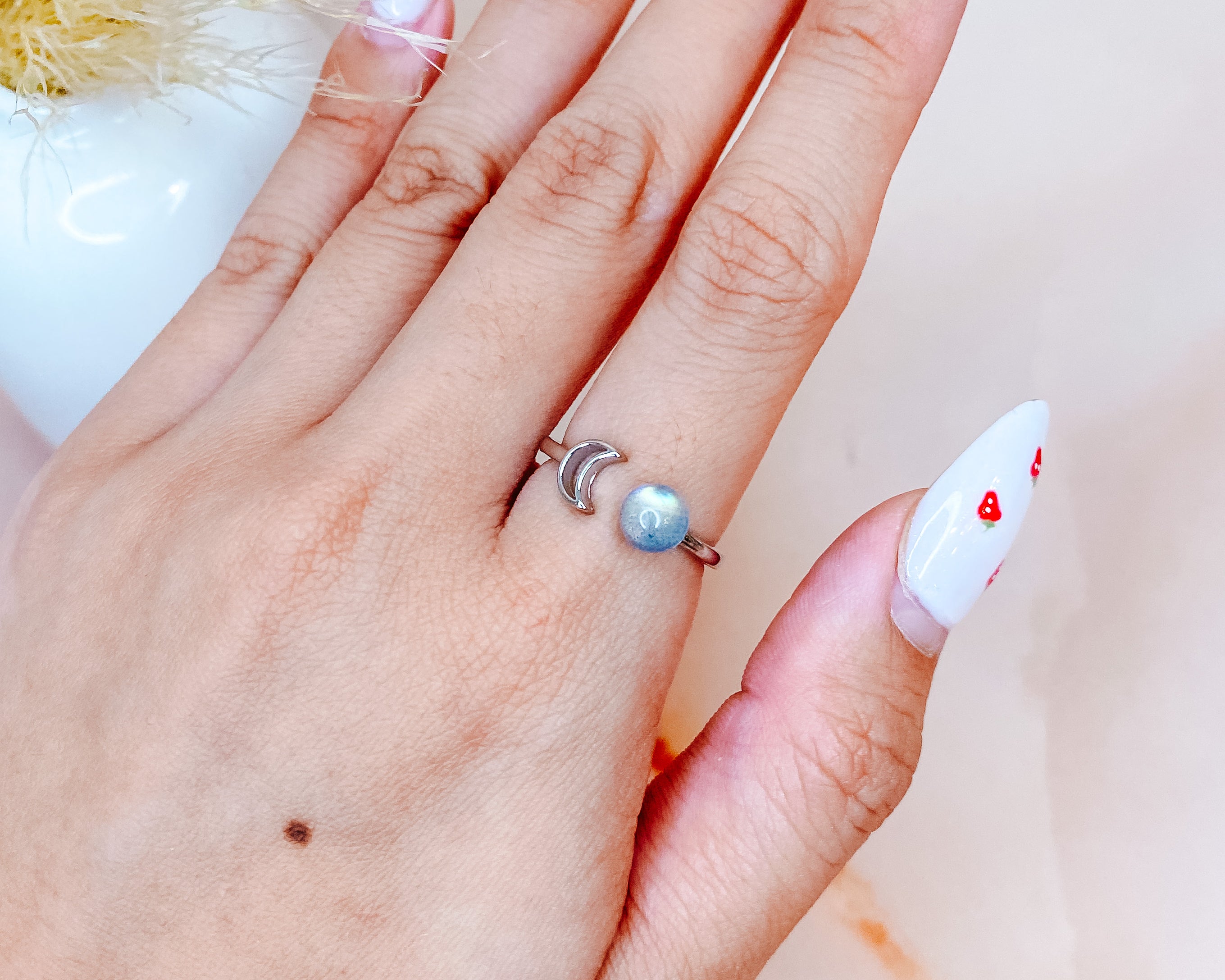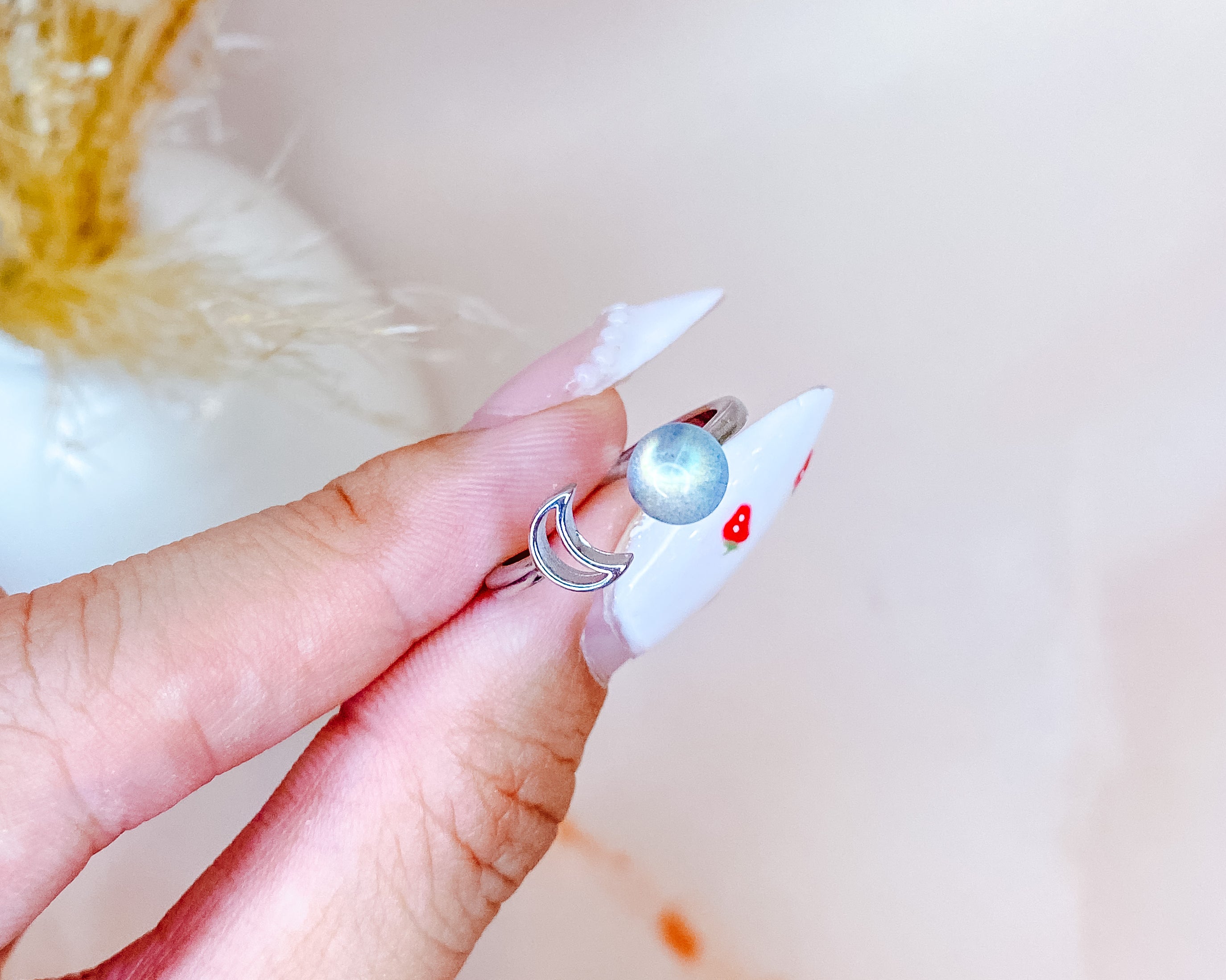 ⟡ Our Labradorite Crescent Moon Rings are available in silver, fully adjustable and feature a cute crescent moon along with a flashy Labradorite bead. Each Labradorite bead is individually unique with different colors of flash ranging from blue, teal, yellow and orange. We love our crescent moon ring collection because they are affordable and make the perfect accessory for everyday casual wear.