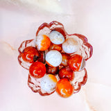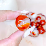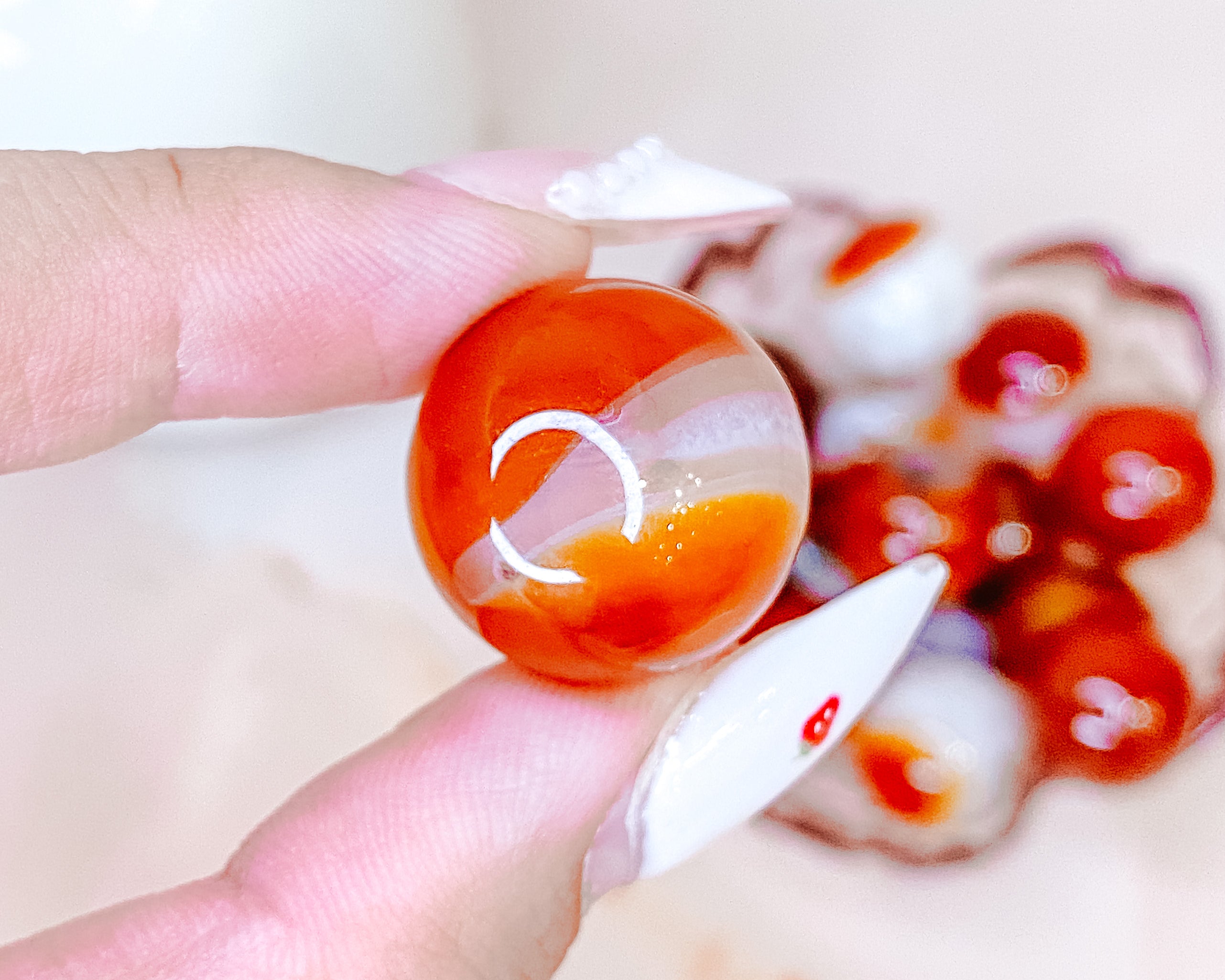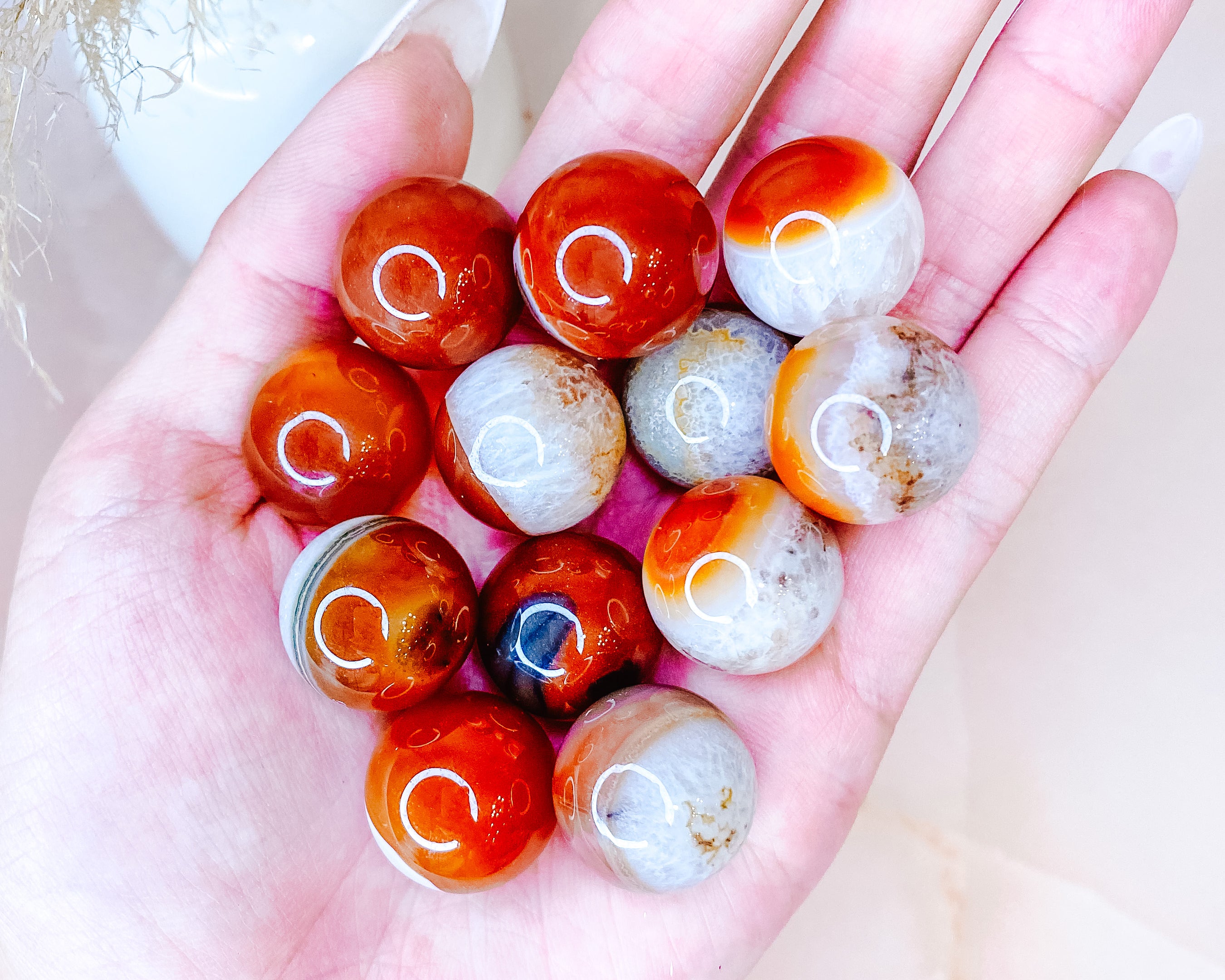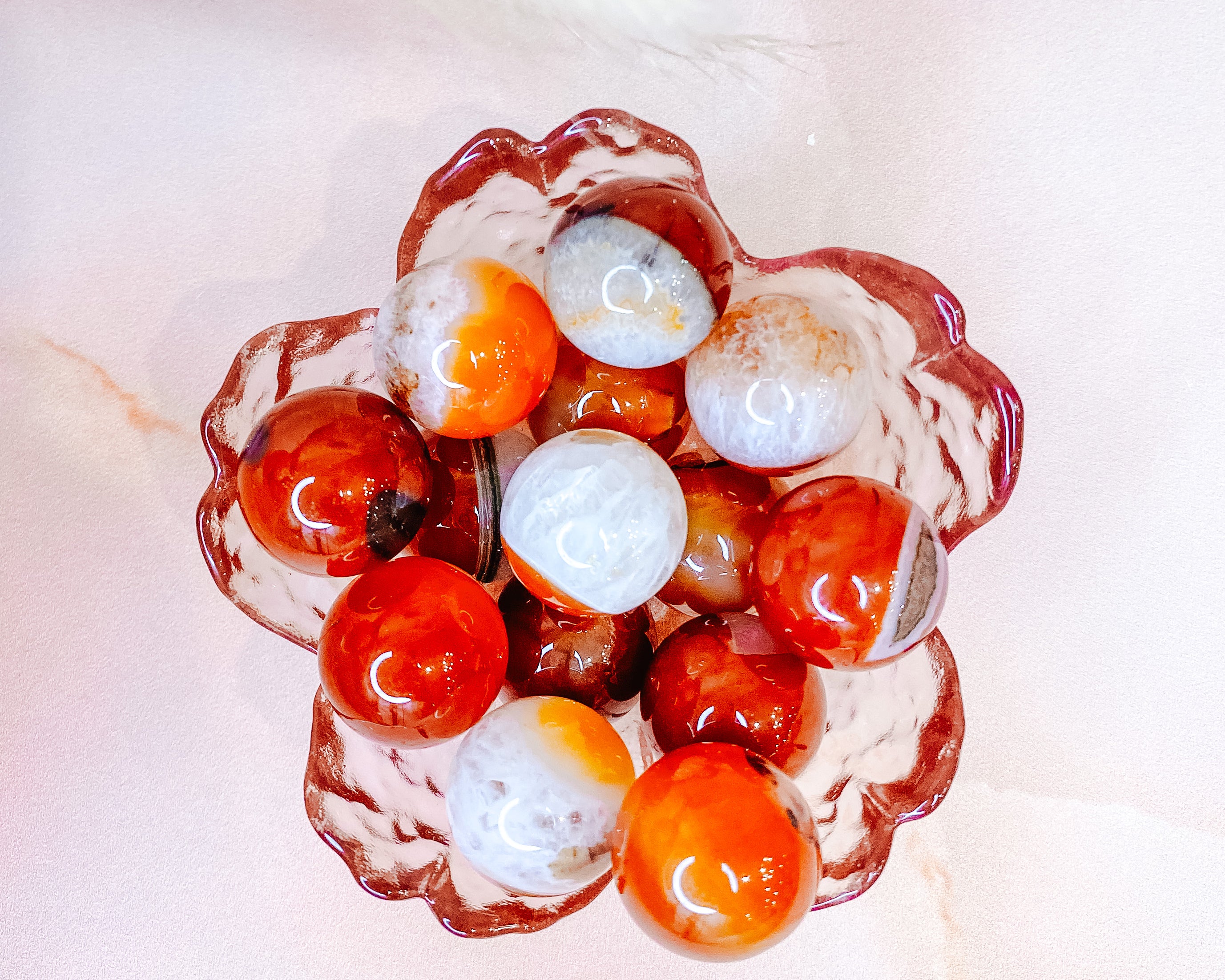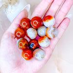 ⟡ We were instantly drawn to these Mini Carnelian Spheres at a gem show and had to choose the best of the best. Most of these mini spheres are a deep saturated fiery red and some even have icy quartz! These mini spheres make the perfect pocket pieces to give you a boost of confidence wherever you go!