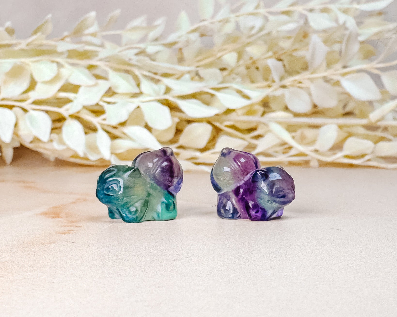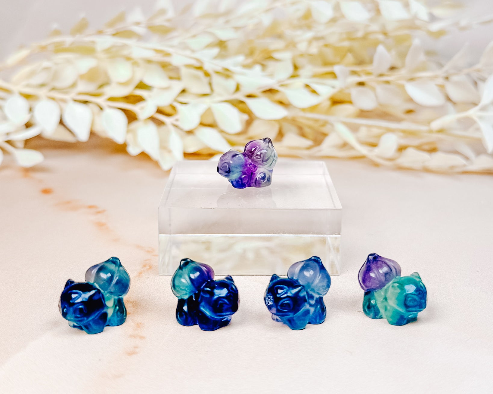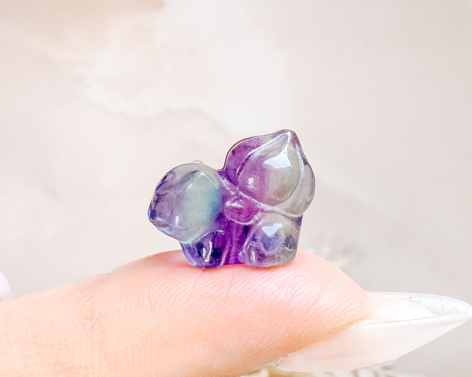 ⟡ If ya'll know us, you know we love our mini carvings! When we saw these juicy Rainbow Fluorite Bulbasaurs, we knew we had to pick a few out! We love Pokemon and think that these carvings would make the cutest addition to any collection. These colorful Bulbausaurs have a variety of different Fluorite shades, however, teal & blue are the most prominent.