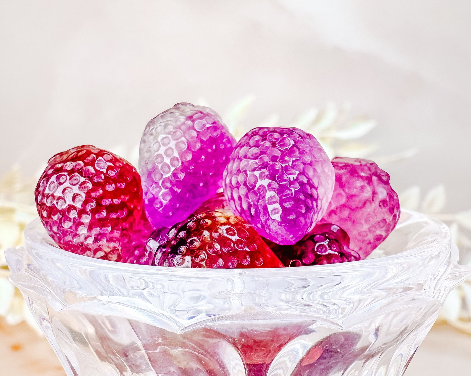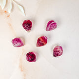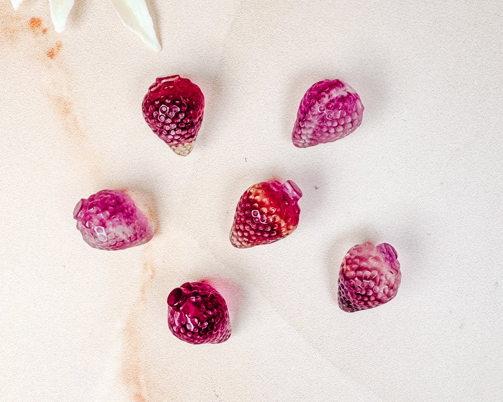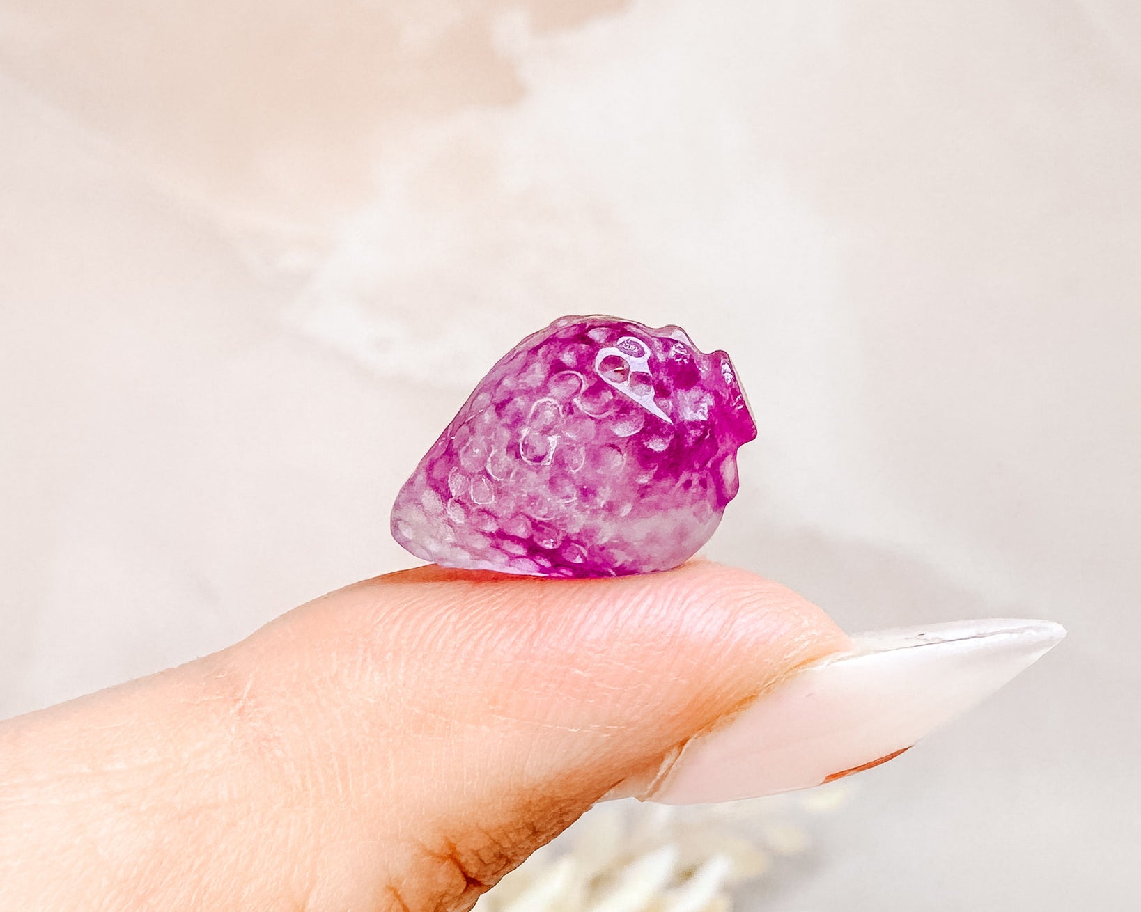 ⟡ These mini Rainbow Magenta Fluorite Strawberries are absolutely the cutest mini carvings ever. We are obsessed with strawberry carvings and have never seen such juicy magenta Fluorite ones!