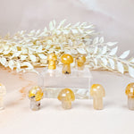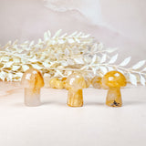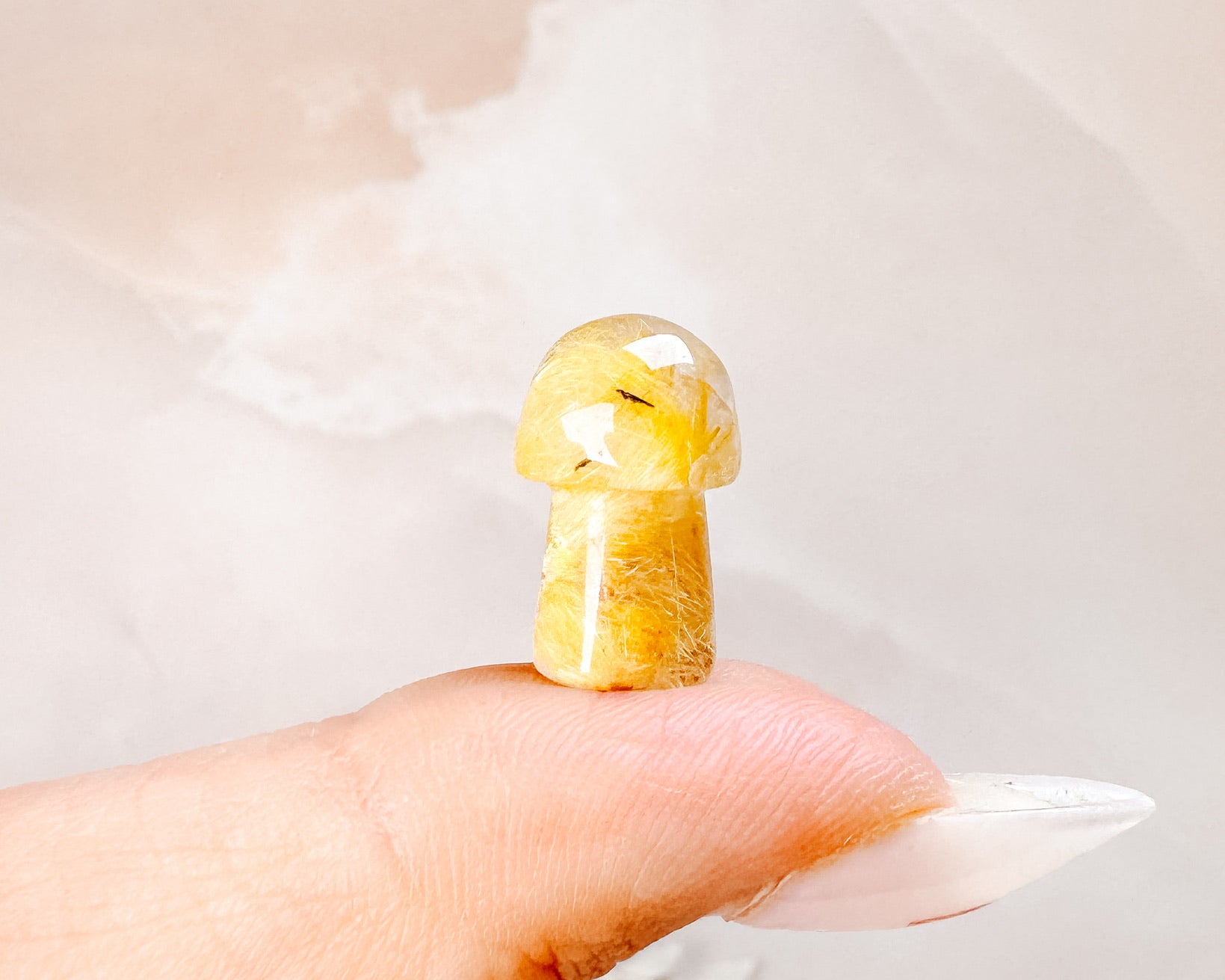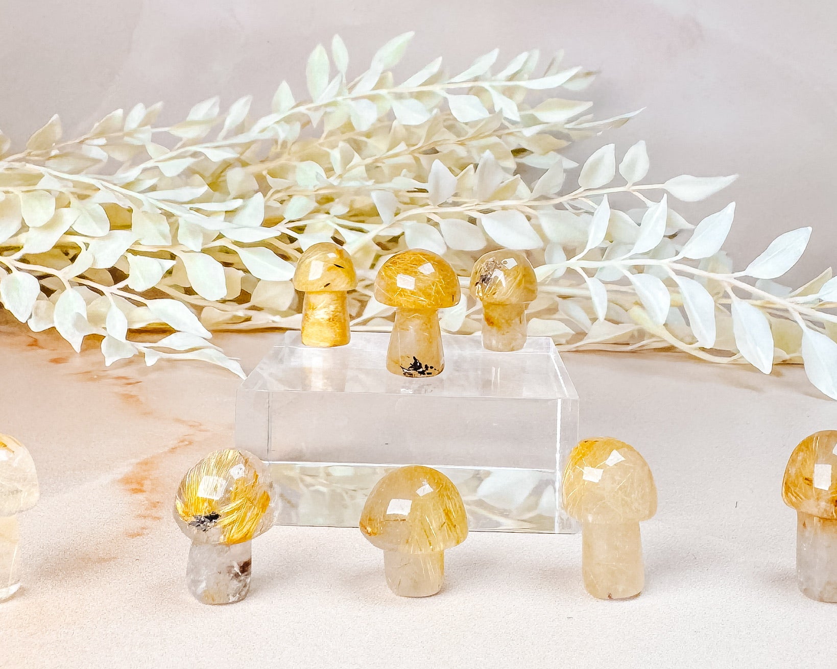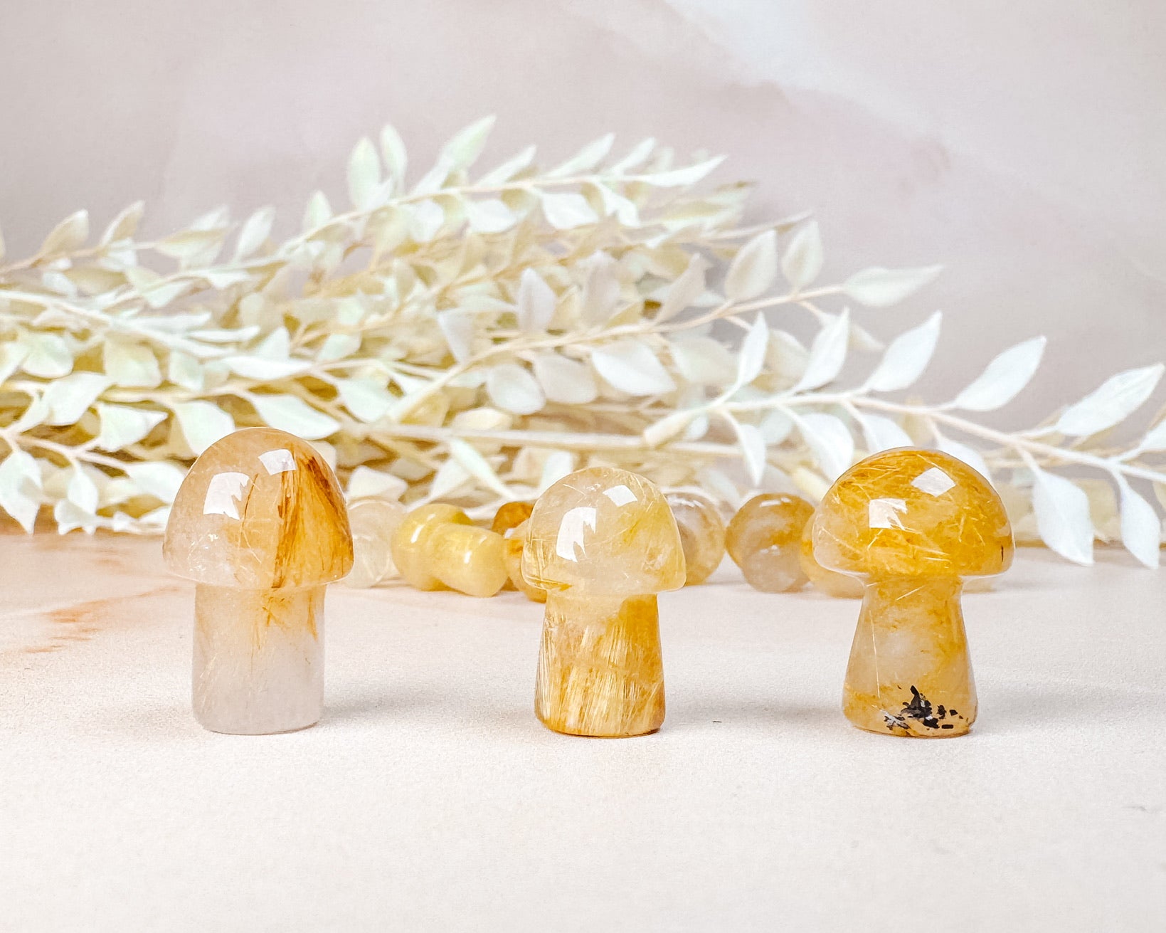 ⟡ These HQ Mini Golden Rutilated Quartz Mushrooms are full of golden rutile strands and are so insanely sparkly under the sun or a flashlight. Not only is Rutile one of our favorite inclusions in Quartz, it is one of the rarest inclusions especially in high quality.