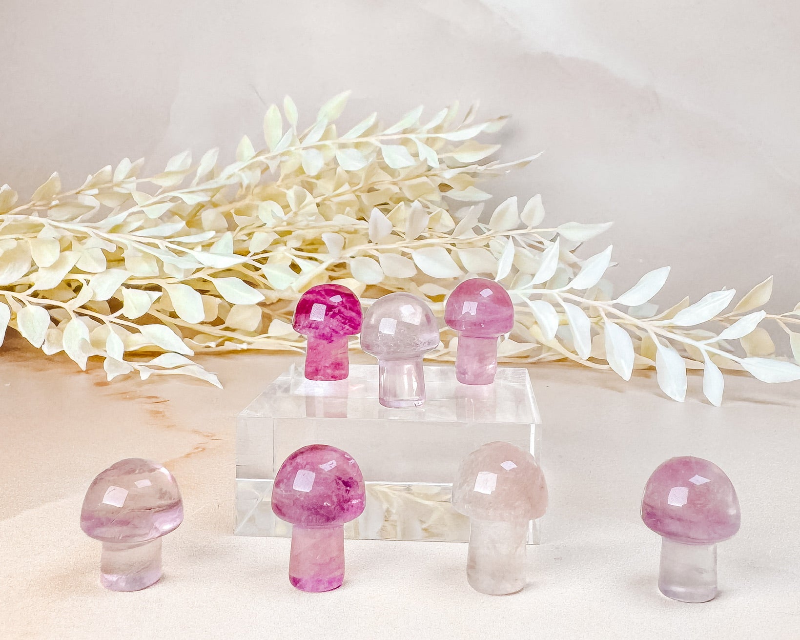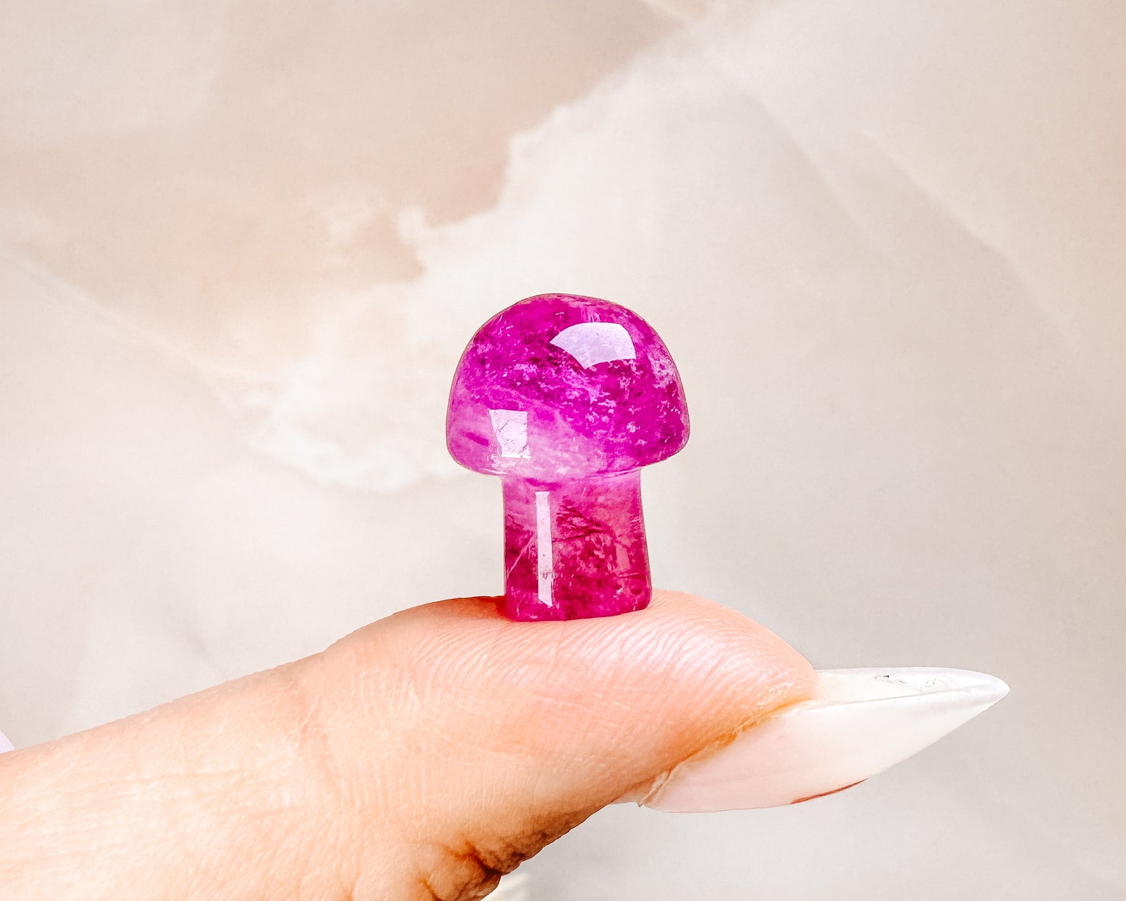 ⟡ We're so in love with these vibrant Mini Magenta Fluorite mushrooms, the shades of pink remind us of a sweet, juicy watermelon on a hot summer day. These mushies mainly pink but some even have a hint of green in them as well! Can you tell that we're obsessed with mushrooms lately? Mushroom carvings are said to be a symbol of enlightenment, good luck and fortune!