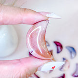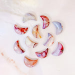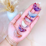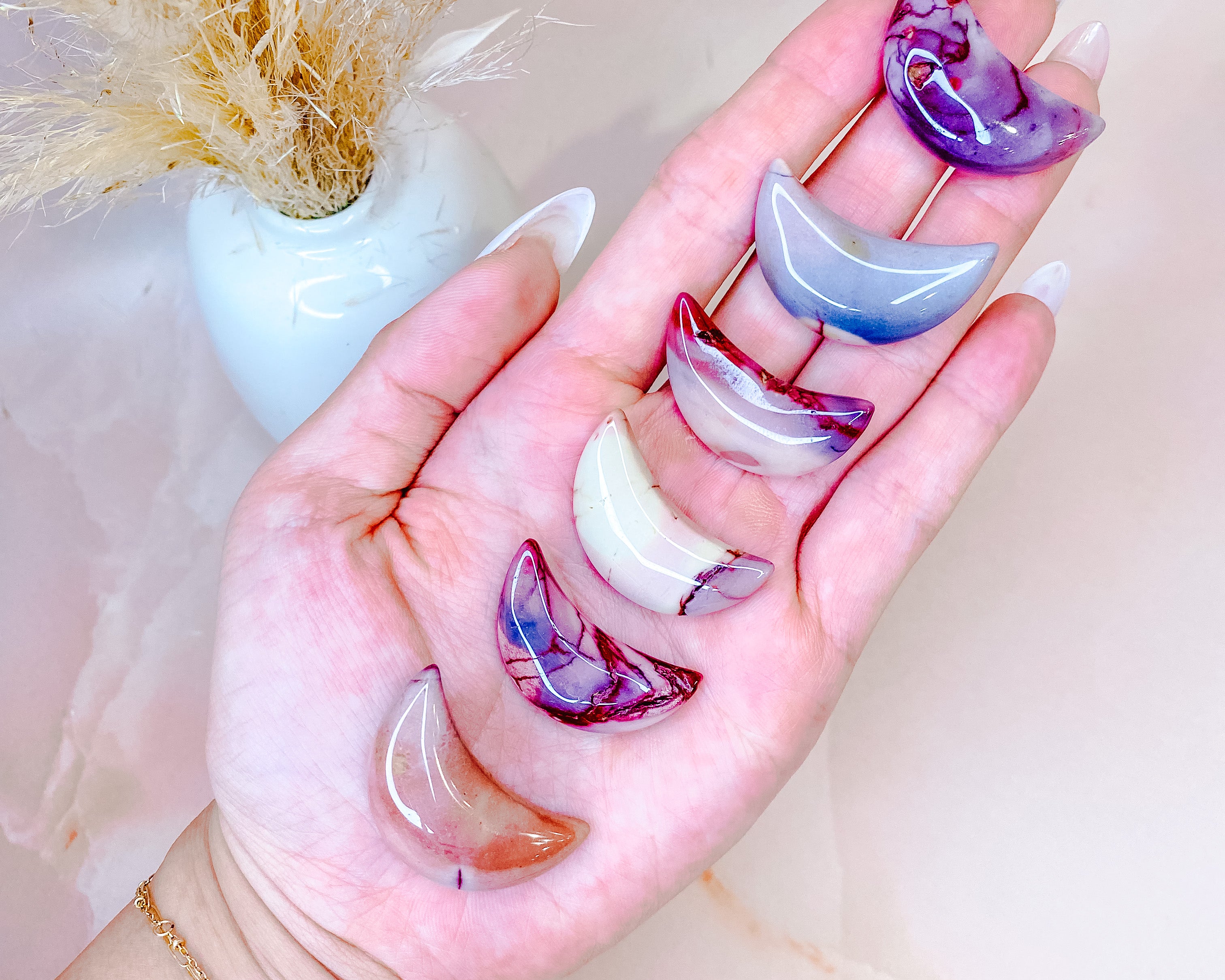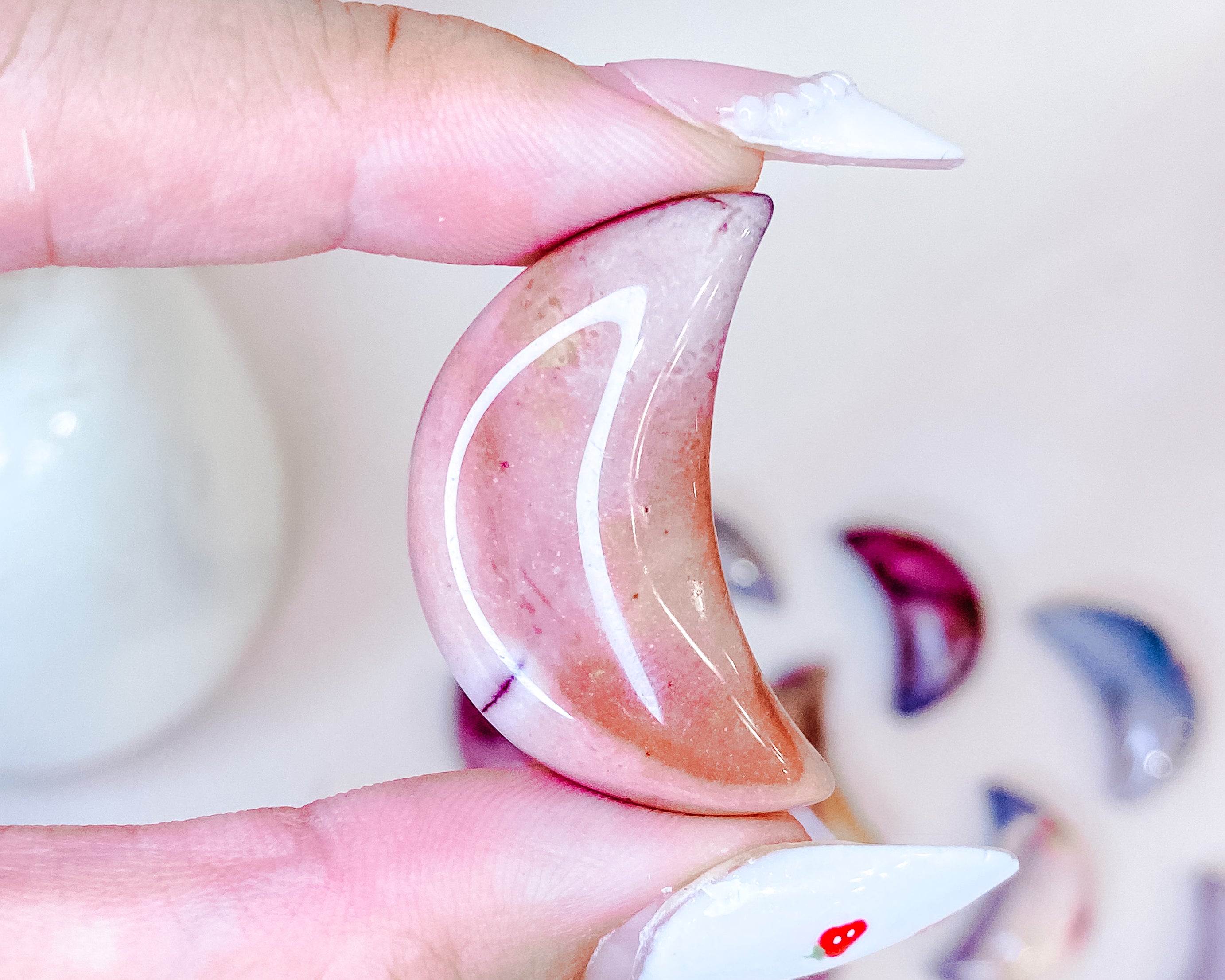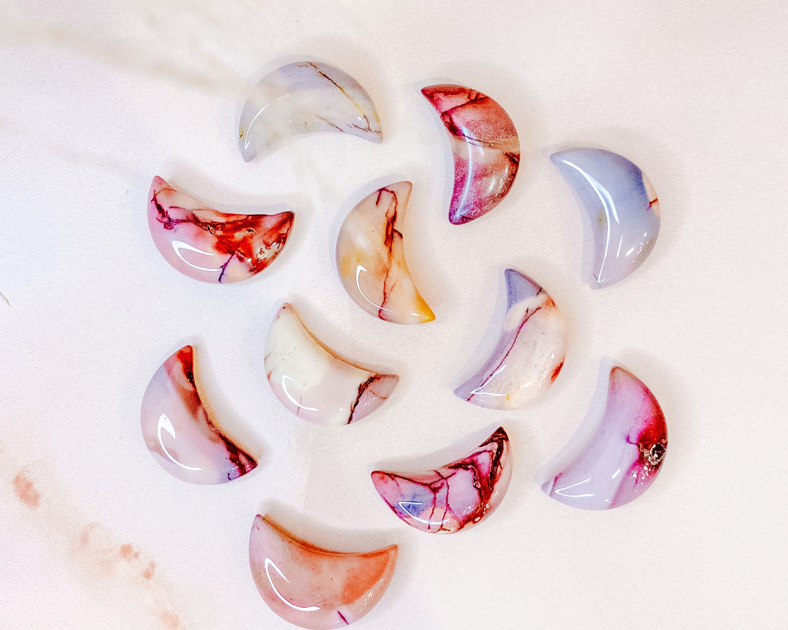 ⟡ We rarely ever source Mookaite, but we were immediately drawn to these HQ, puffy mini moon carvings while gem hunting. Each one of these mini moons have such gorgeous colors ranging from red, maroon, purple, pink, blue to creamy yellow. Crescent moon carvings symbolize tranquility and protection, making them one of our favorite shapes to work with. We love the strong feminine energy they carry, making them amazing tools for full moon rituals and spiritual work.