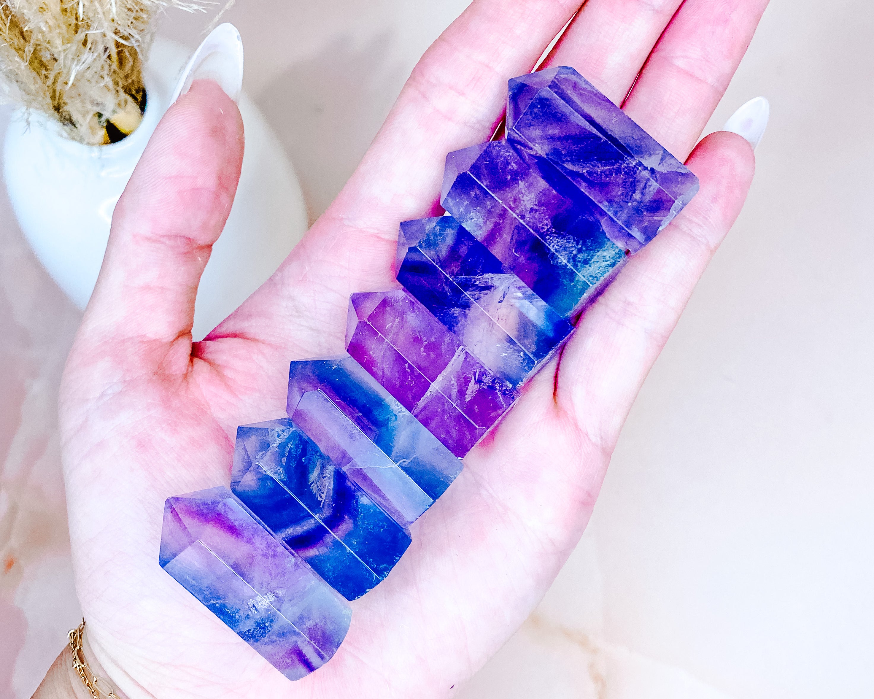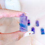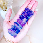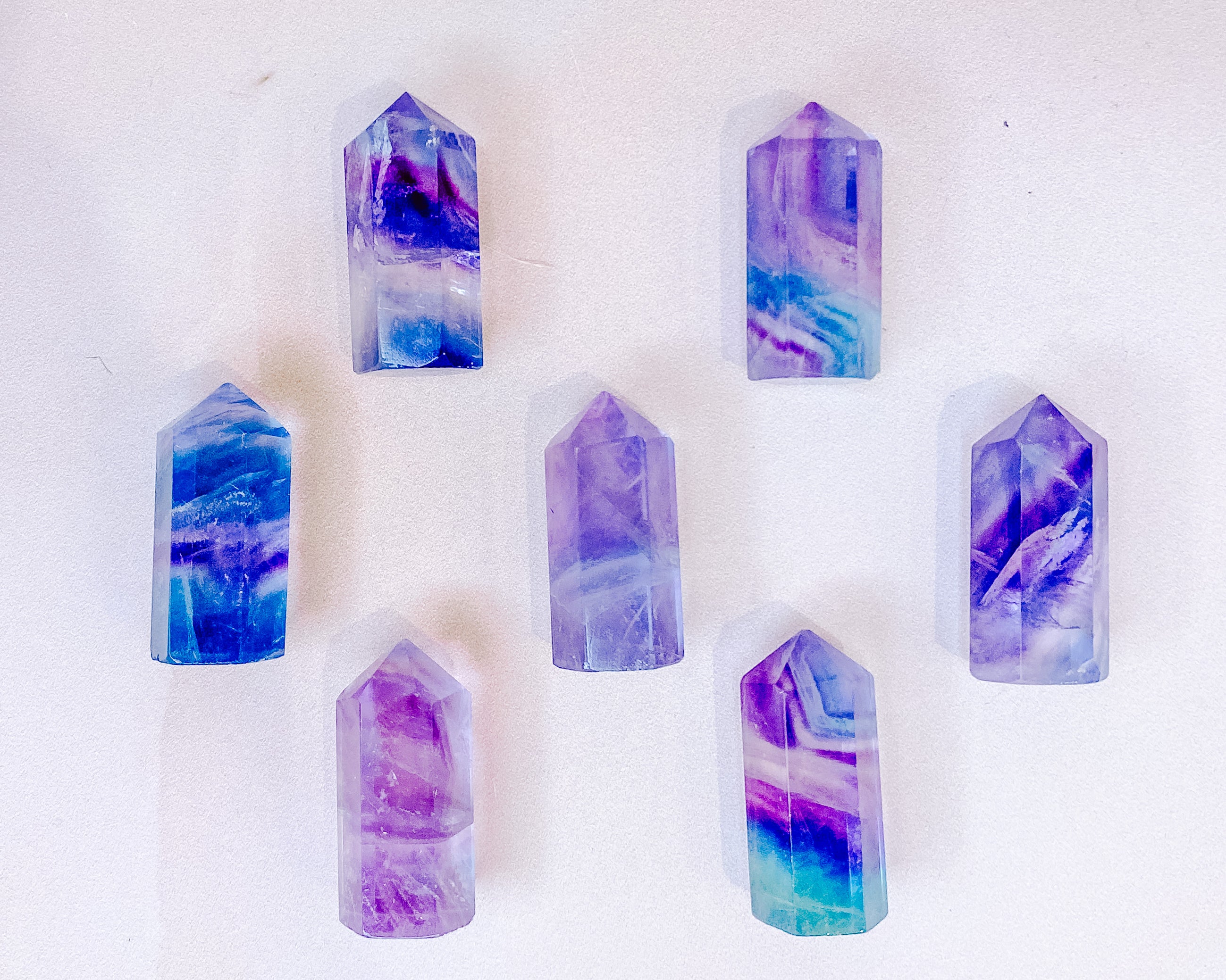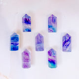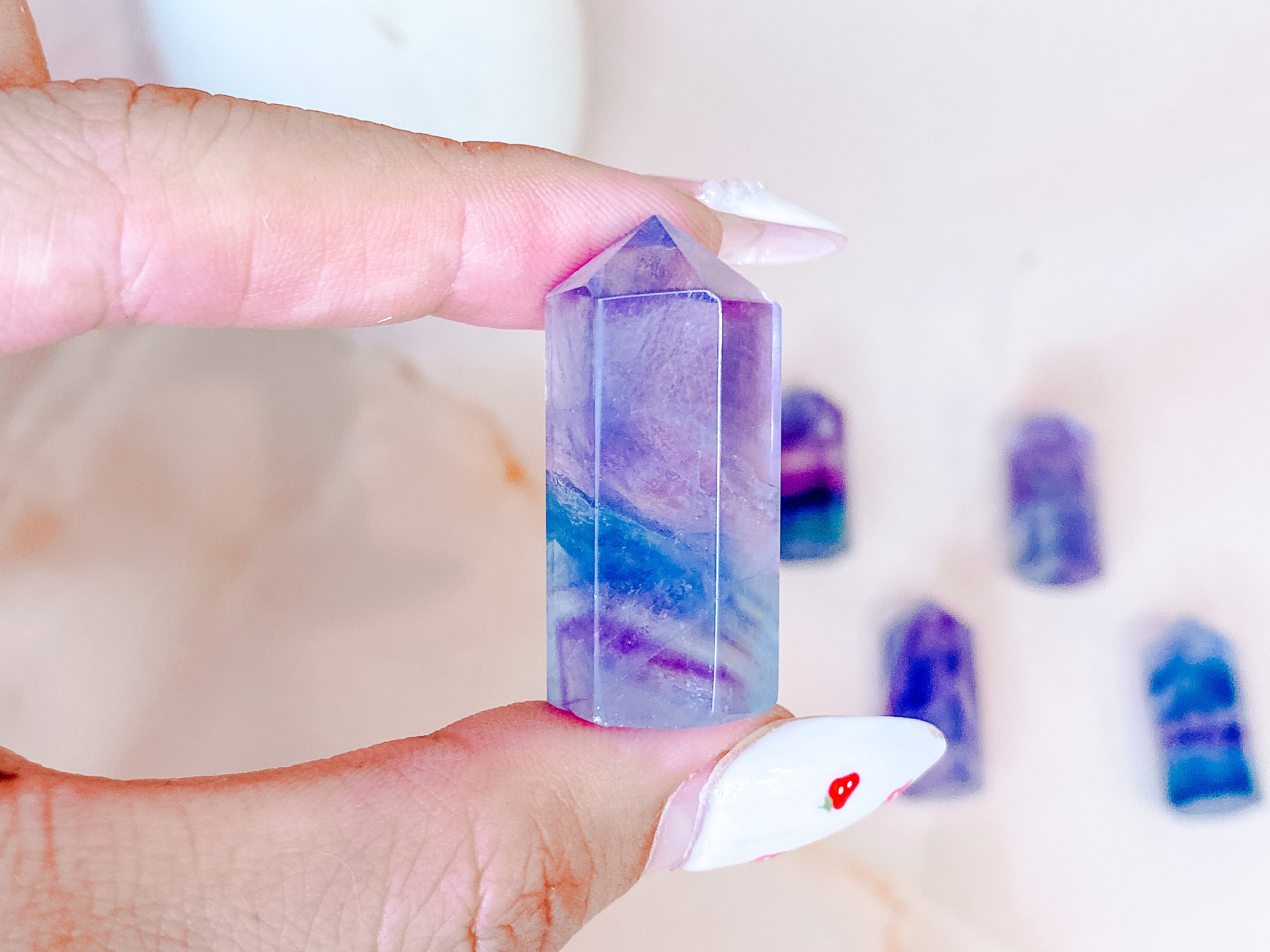⟡ Our Mini Rainbow Fluorite Towers are extremely high quality, water clear and range in a variety of colors from magenta, purple, green and blue. We could literally stare into these mini towers all day and get mesmerized by each and every one of them. All of our Mini Fluorite Rainbow towers have their own unique features whether it be colorful stripes, juicy hues or hidden rainbows!