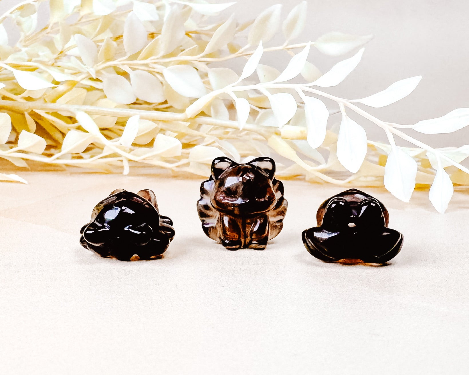 ⟡ If you're familiar with us, ya'll know how much we love sourcing nine-tailed fox kitsune carvings. These adorable Mini Smoky Quartz Kitsune carvings are perfect for those who collect kitsune carvings and they even have drill holes to make jewelry out of. However, if you don't make jewelry, the drill holes are unnoticeable and these carvings self stand on their own!