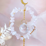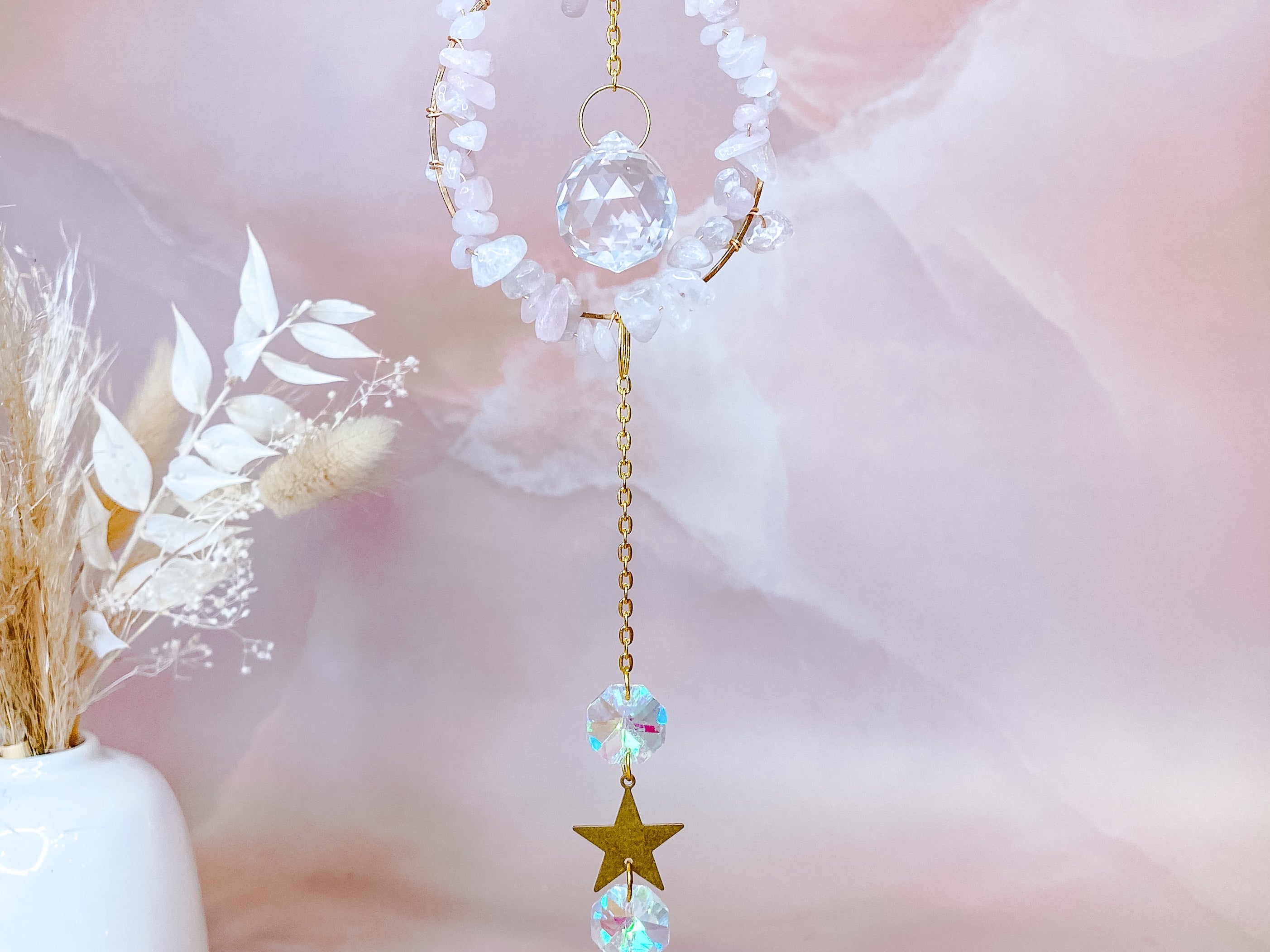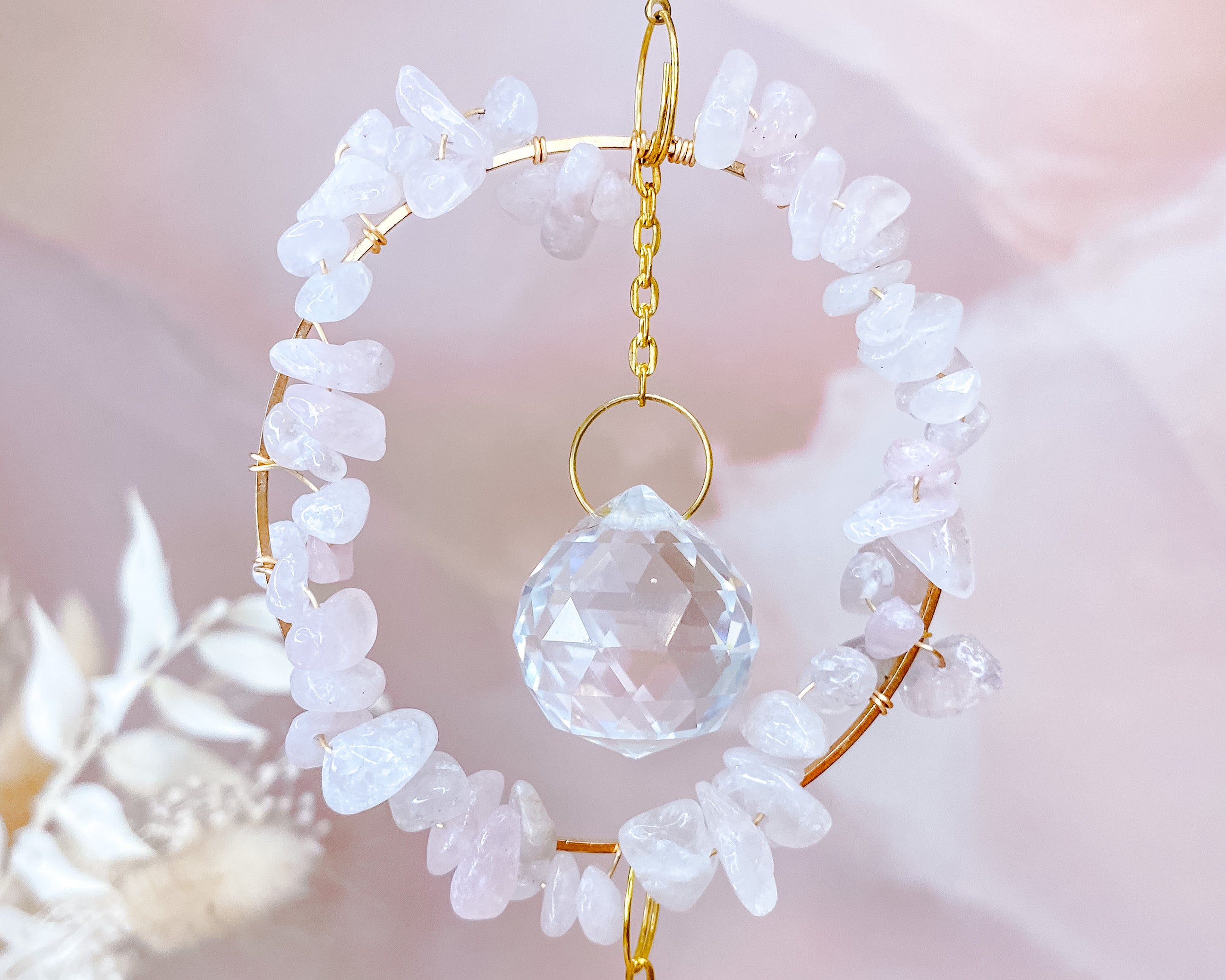 ⟡ Our Rose Quartz Circle Suncatchers feature a gold chain along with a delicate gold circle adorned with Rose Quartz pebbles. We love how our circle shaped suncatchers have two clear faceted acrylic circles, meaning they are able to reflect even more light and rainbows. These suncatchers radiate such bright, positive energy and reflect rainbows when the sun is out. They would make the perfect addition for your bedroom, living room, garden or patio!
